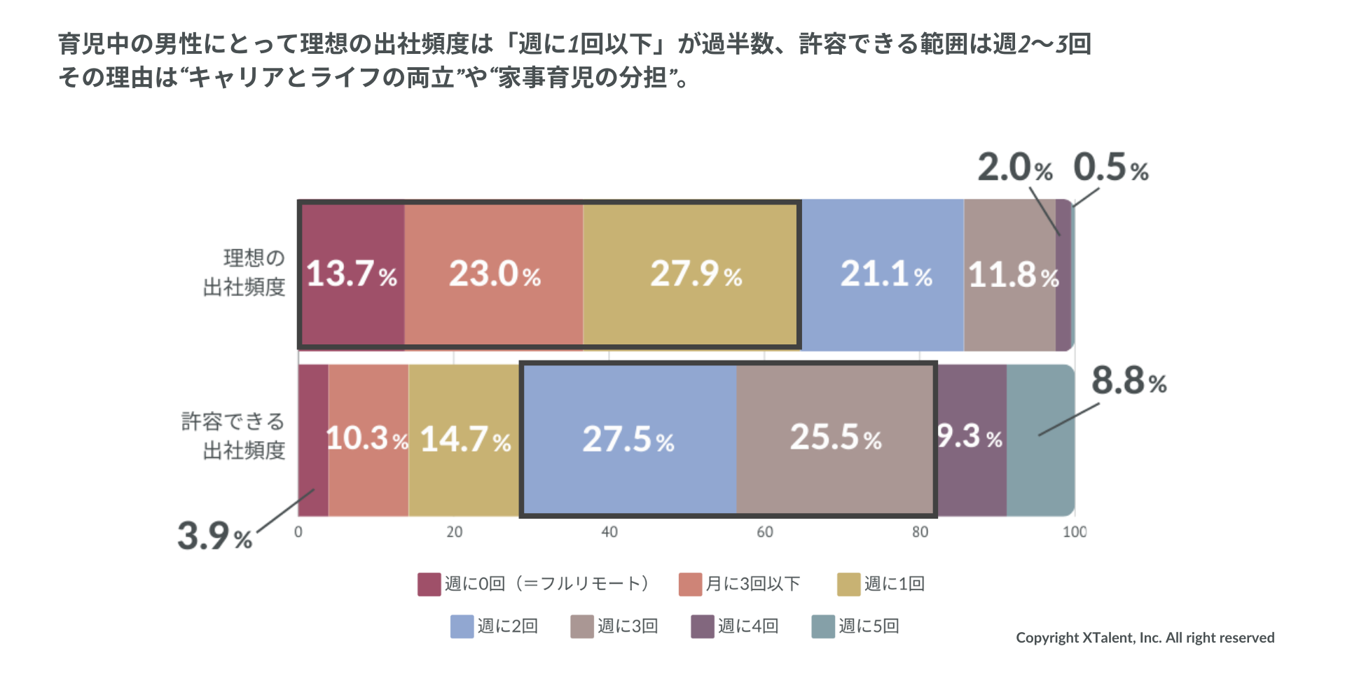 育児中の男性に出社頻度について尋ねると、週に1回以下の出社が理想と答えた人が過半数を超え、許容できる範囲は週2〜3回となった。その理由を自由回答で求めたところ、キャリアとライフの両立や家事育児の分担の観点から、リモートワークや出社回数の調整を求める声が多く挙げられた。