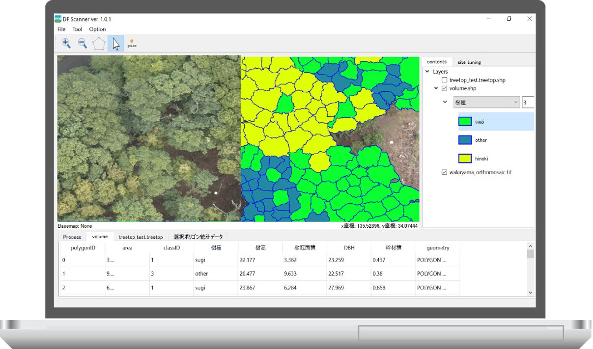 「DF Scanner」はドローンで撮影した写真などから森林情報を解析するソフトウェアです。ドローンで撮影した画像を利用する場合、当社が既に取り扱っている Pix4D 社製処理ソフトウェア等を用い、森林解析に必要なデータを生成し、「DF Scanner」の特徴である AI を活用した解析機能により、スギ・ヒノキだけでなく、モミやアカマツなどの針葉樹やコナラ・ブナなどの一部広葉樹など計 60 種ほどの識別を行い、各樹木の検出、樹種識別、樹高、DBH(樹木の胸高直径)、幹材積推定を各樹木単位で一元的に解析をすることで、日々の維持管理作業の効率化、デジタル化が期待できます。
