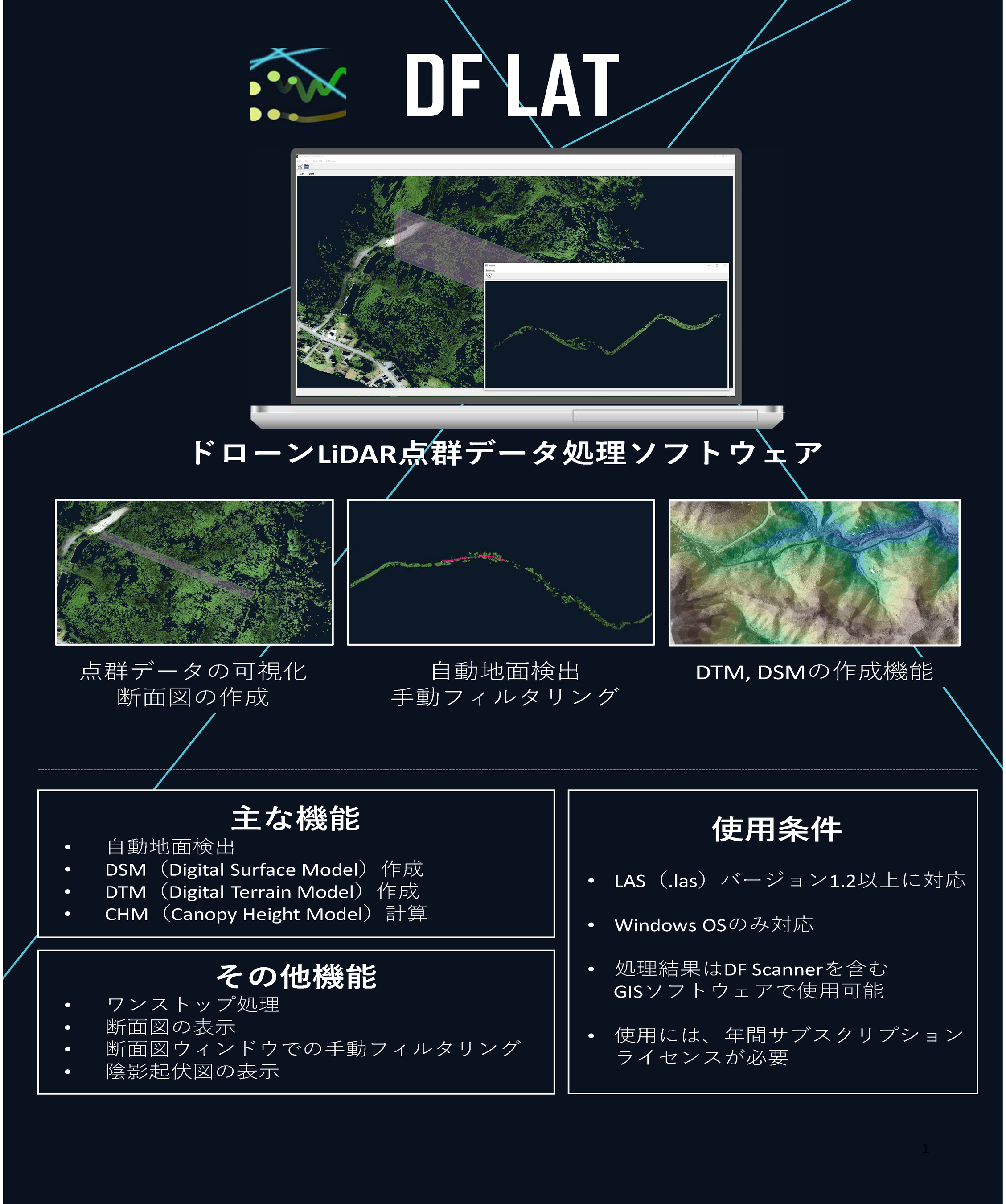 「DF LAT」はレーザードローンで取得した三次元点群データから詳細な地形図や樹冠高データなど、森林解析用のデータ生成を行うソフトウェアです。市販のレーザー搭載ドローンのデータから、樹木の下の地面部分の検出、概ね 5cm 解像度の数値地形データならびに数値標高データの作成などが可能となり、林内の作業道や微地形などを確認することができます。