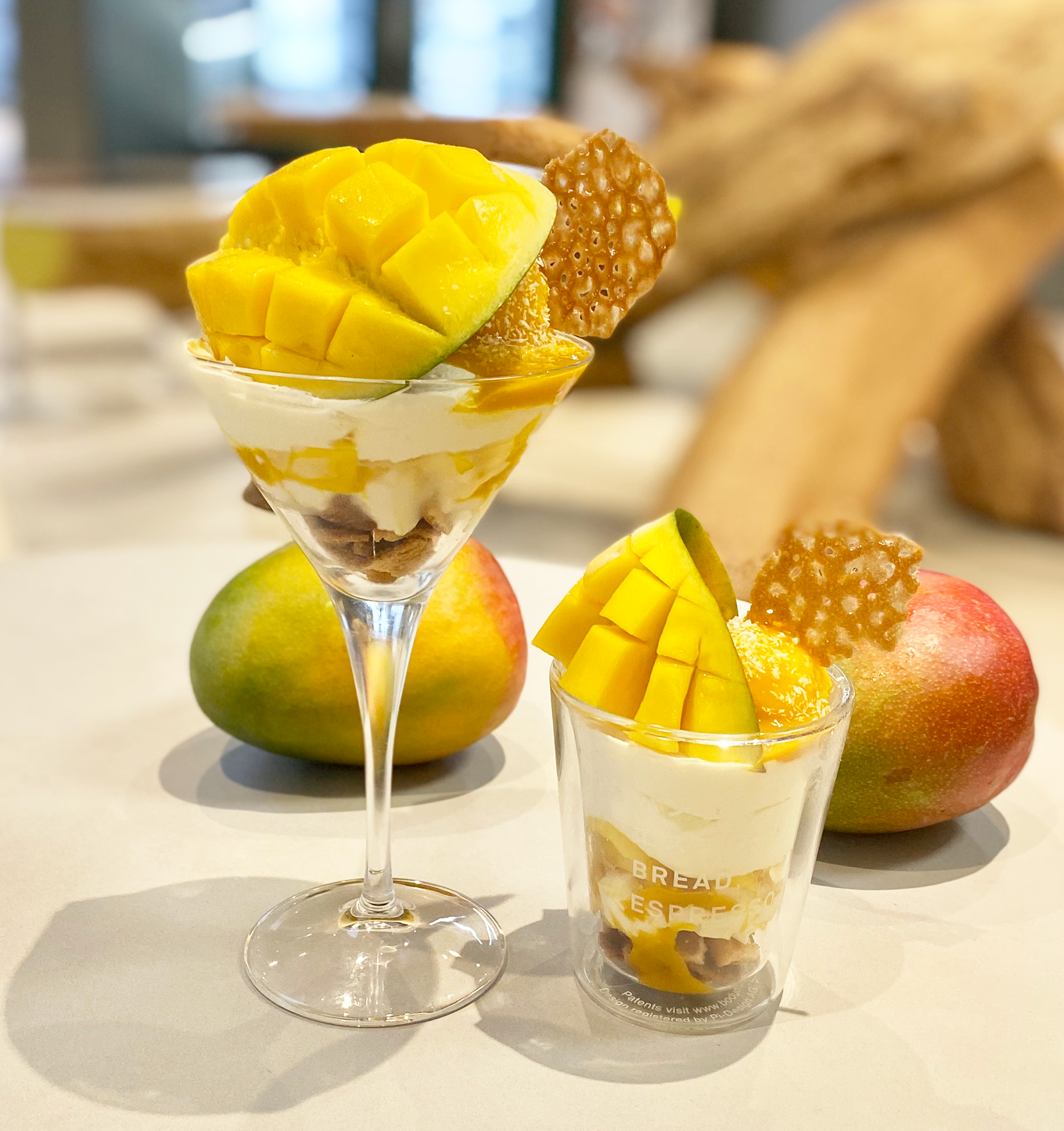 アップルマンゴーを丸ごとトッピング。自家製クラム、杏仁豆腐、マンゴーシャーベット、マスカルポーネクリームを詰め込んだ、アップルマンゴーの美味しさを存分に味わえる贅沢なパフェ。