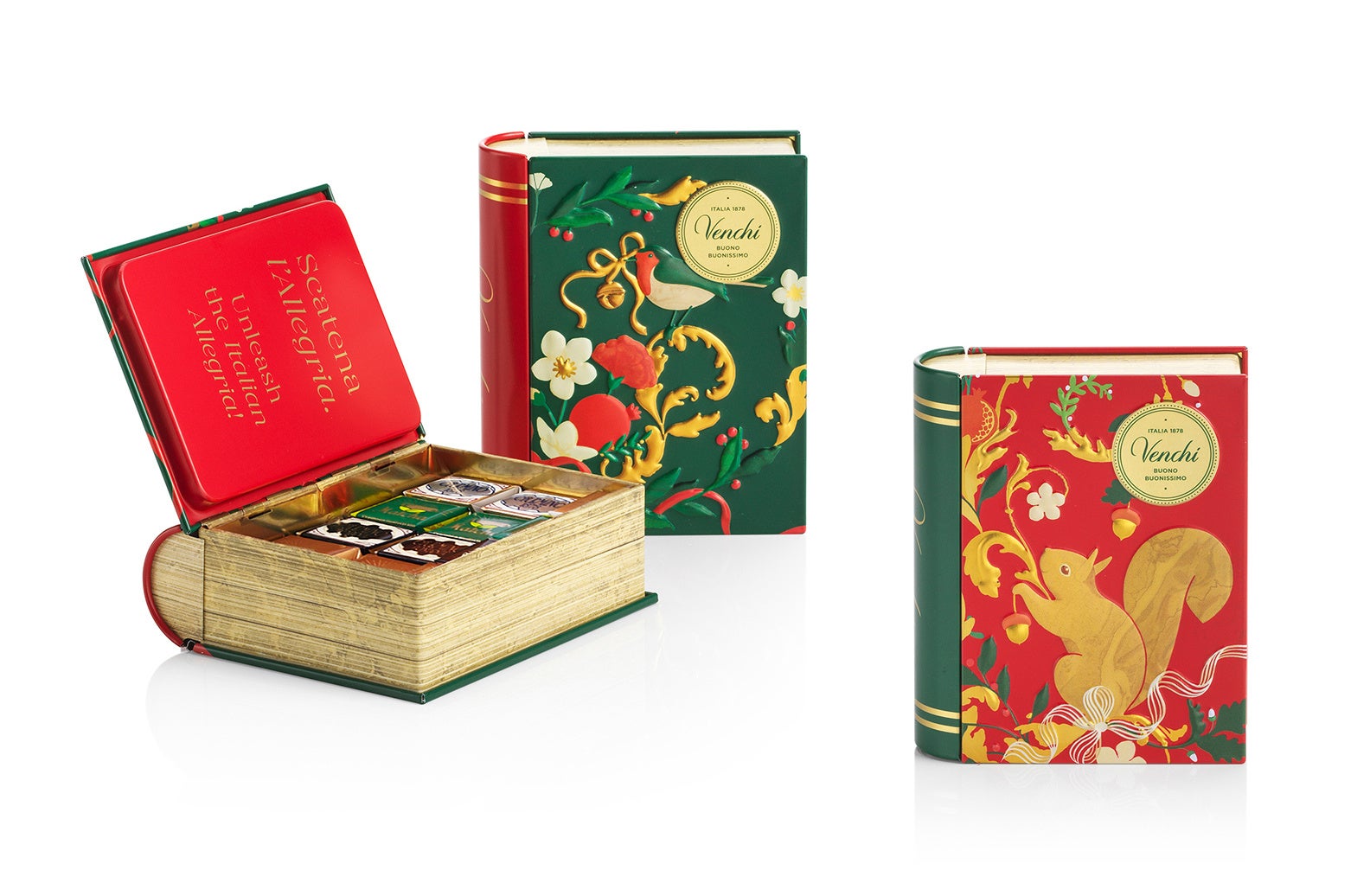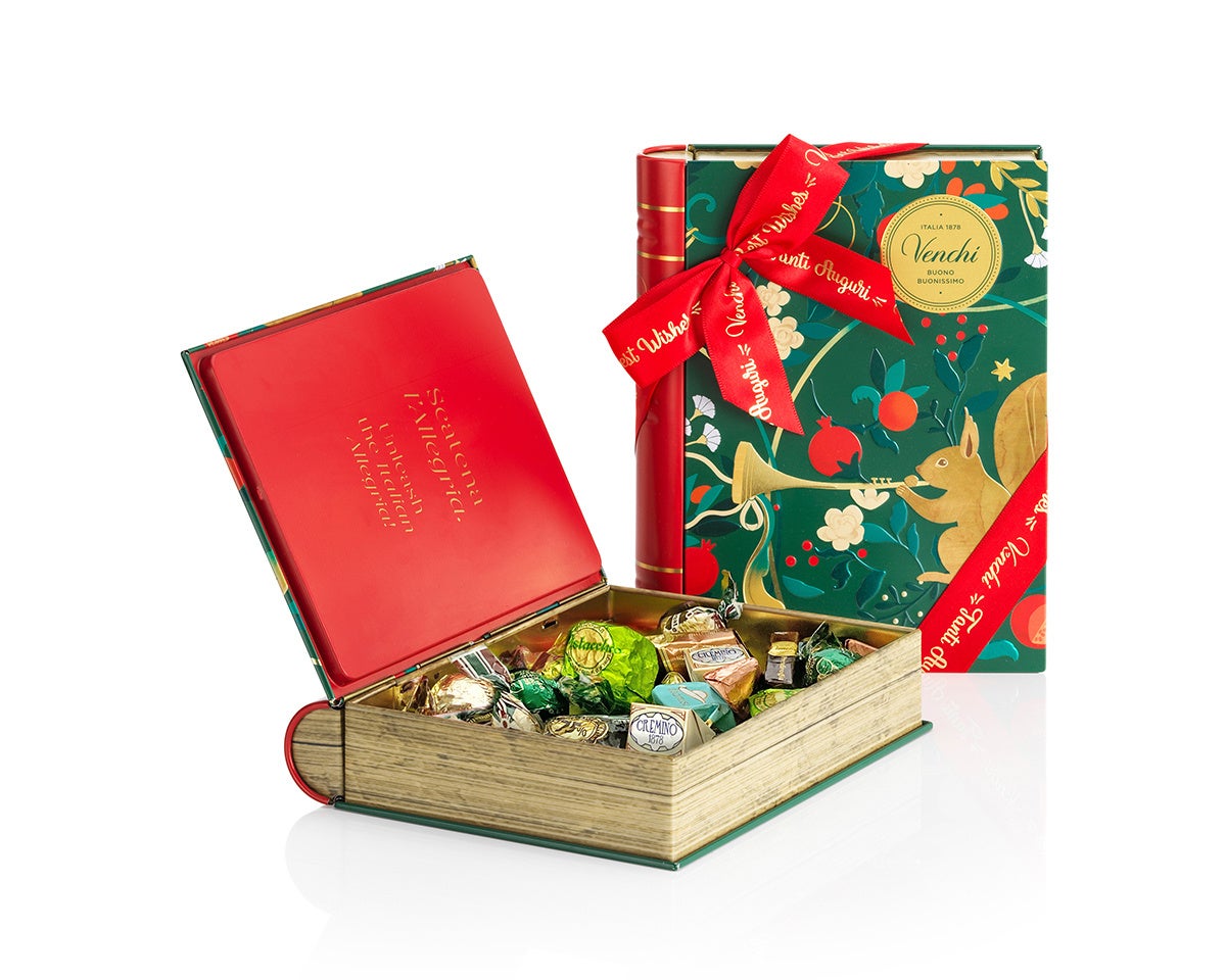 クリスマスの物語が詰まった小さなブック缶。深いグリーンが印象的なコマドリ柄と、鮮やかな赤にどんぐりのオーナメントを持ったリス柄の2種類です。イタリア伝統のチョコレート「クレミノ」2種と抹茶やカプチーノを表現したチョコレート、計4種類12個を詰め合わせました。