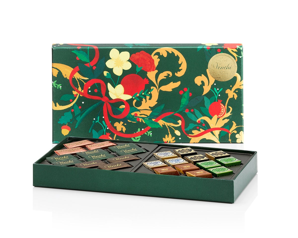 冬の植物がブーケのように描かれたシックな冬のギフトボックス。ゴールドの差し色がホリデーシーズンを華やかに彩ります。ヴェンキのアイコン的なチョコレート、ジャンドゥイオットやクレミノなど7種類24個を詰め合わせました。