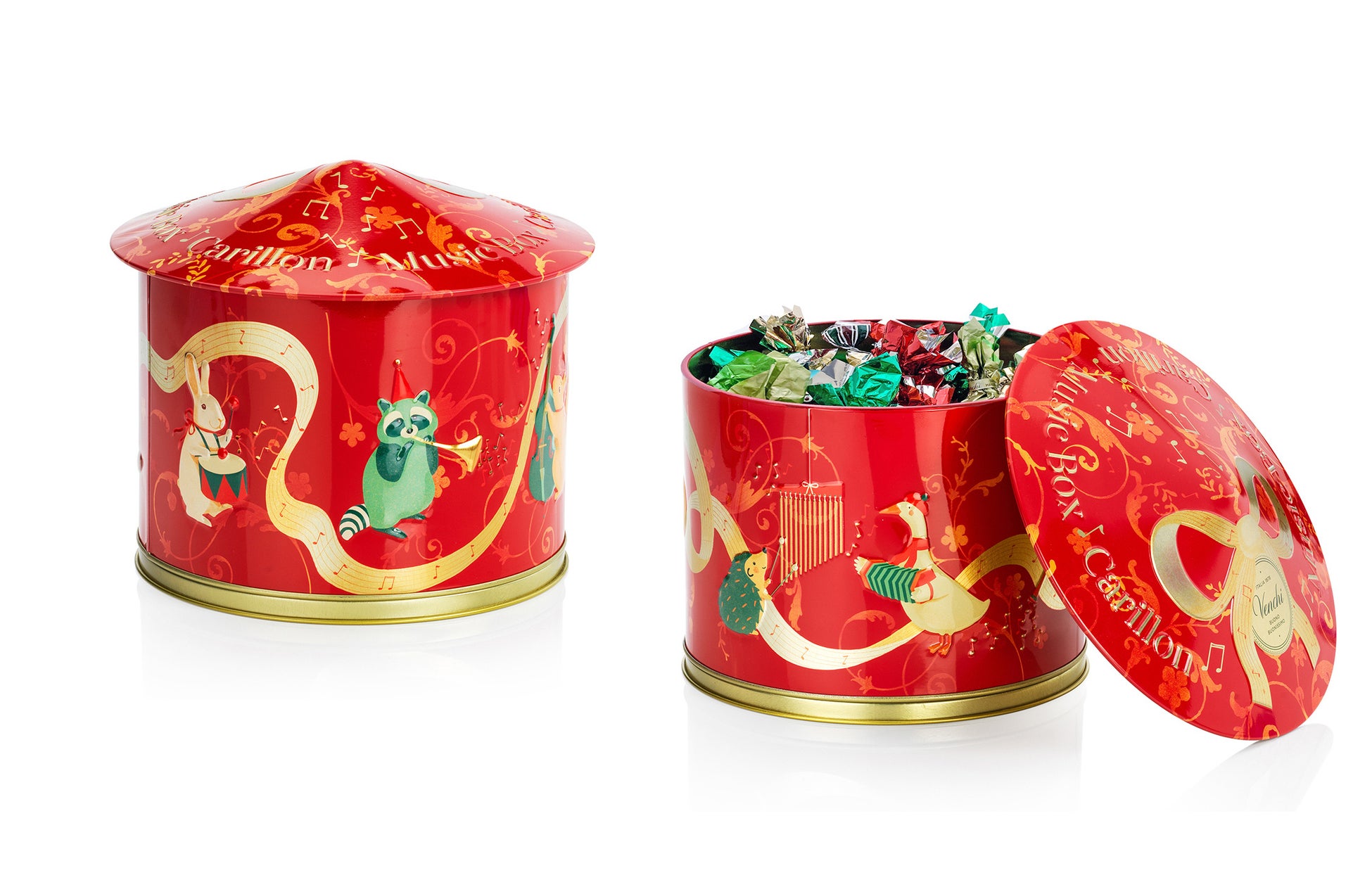 今年新登場の大きなギフト缶はオルゴール付き。底面を回してねじを巻きテーブルに置けば、クリスマスソング(We Wish You a Merry Christmas)が流れ、楽器を奏でる小さな動物たちが描かれた缶が回転します。彗星をイメージしたきらきらとした包装紙で包んだコメッツなど、ピック&ミックスで人気のチョコレート11種類46個が入っています。