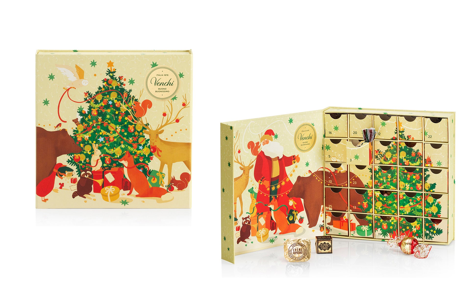本の形をした豪華なアドベントカレンダー。25個の小さな引き出しには、10種類の多彩なレシピのチョコレートが隠れています。表紙には動物たちがクリスマスツリーを飾りつけている様子、内側にはサンタと一緒に動物たちがクリスマスの準備をしている様子が描かれています。引き出しの向きを変えればパズルのように4種類の絵が楽しめるのもポイントです。