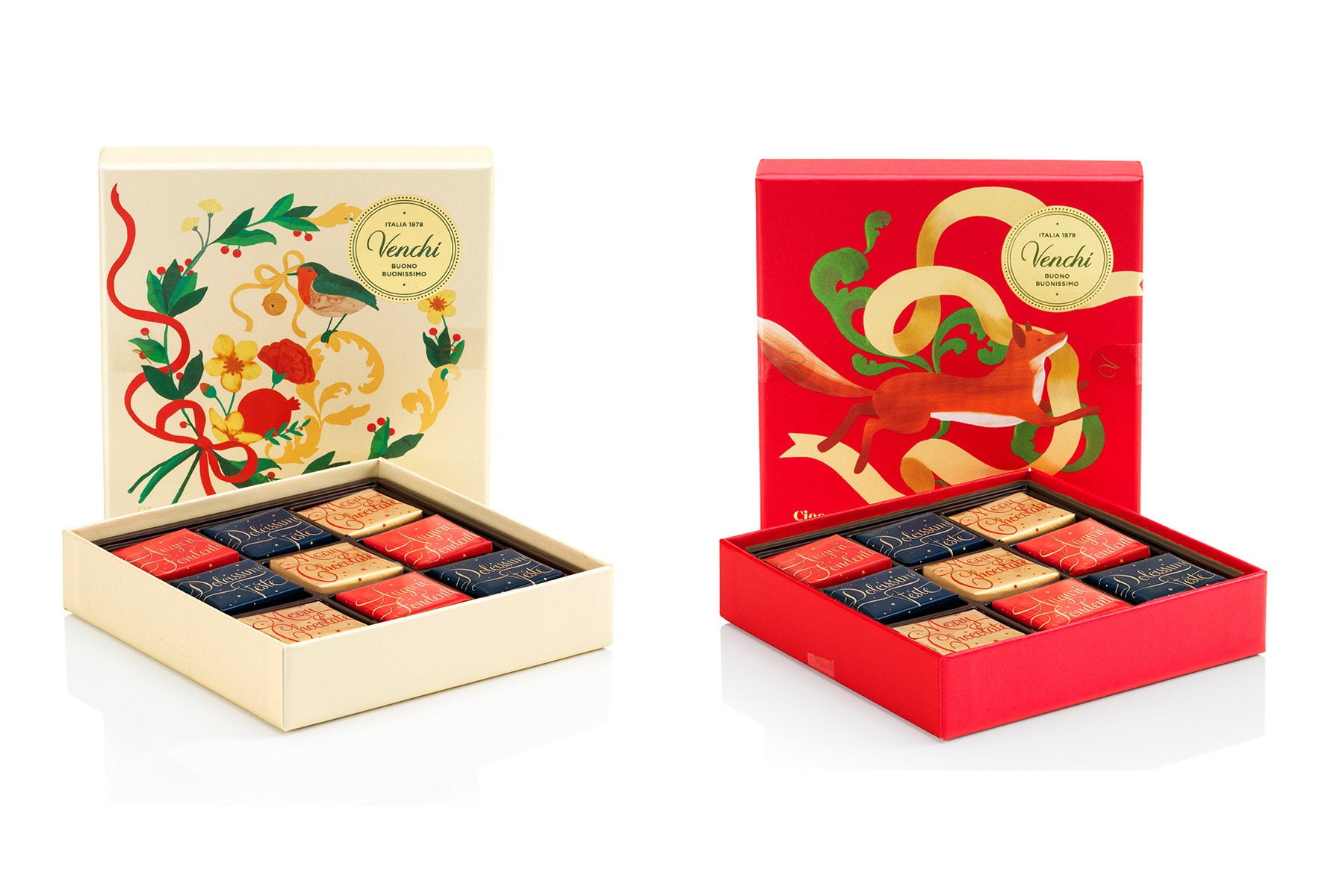 クラシカルな印象のスクエア型のギフトボックスに、ミルクとダークのグランブレンド(シンプルなスクエア型のチョコレート)が詰まっています。柊のリースを飾りつけるコマドリ柄と、ゴールドのリボンとキツネ柄の2種類です。