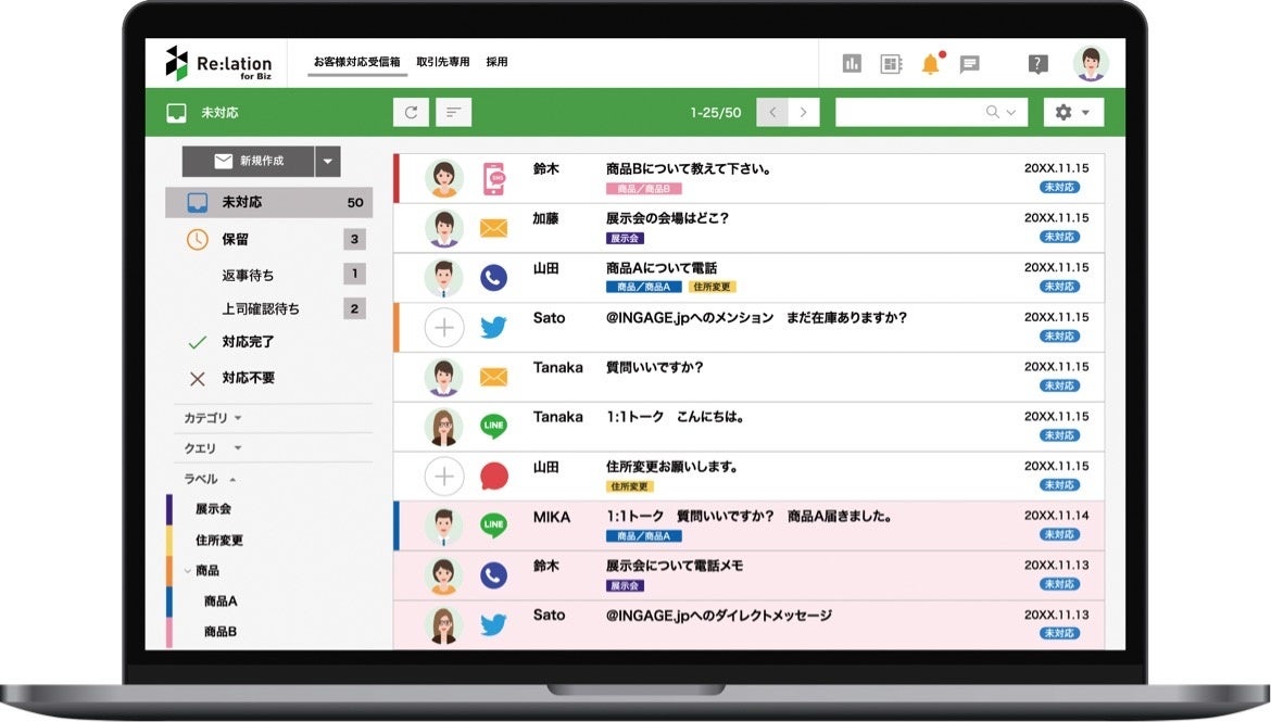 『Re:lation』は、メール・チャット・LINE・Twitterなど様々な問い合わせ情報の一元管理・社内共有を可能とし、テレワーク下においても企業の生産性向上、業務可視化に寄与するサービスとして、リリース7年で導入社数は3,500社超、利用継続率は99.7%を達成しています。