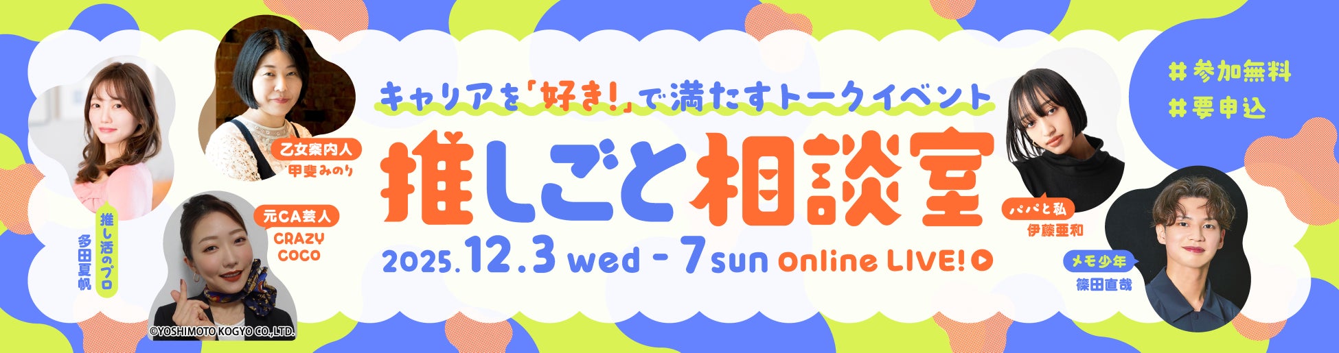 ▶大阪府は、「働きたい」と思うすべての方を応援する総合就業支援拠点「OSAKAしごとフィールド」の取組の一環として、「キャリアを「好き!」で満たすトークイベント 推しごと相談室」を開催します。 ▶本イベントの対象は、離職中の方、就職を考えている方、将来を見据えてキャリアアップや転職を考えている方など、様々な状況の若者です。 ▶自分や誰かの“好き”を原動力にキャリアを築いてきた様々な分野のゲストに、自分の“好き”の見つけ方や“好き”を仕事に生かす方法などを語っていただき、参加者が『“推せる自分”=キャリア』を描き、自ら選択して歩むためのヒントをお届けします。 ▶本イベントでは、ゲストによる講義の後、参加者の悩みや質問にお答えする相談タイムを設けます。相談方法は「事前に相談投稿フォームへ投稿」「当日にライブ配信のコメント欄で質問」に加え、収録に参加し「ゲストに直接相談」したい方も募集します。参加者とゲストをリモートで繋ぎ、参加者の相談に寄り添います。 |