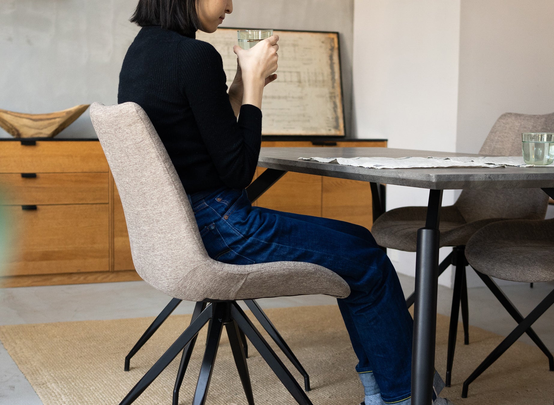 ダイニングチェアは、コーディネートしやすいグレーとベージュの2色展開。上質なファブリックを採用し、背もたれから座面にかけて施された縦のステッチが上品な印象に。