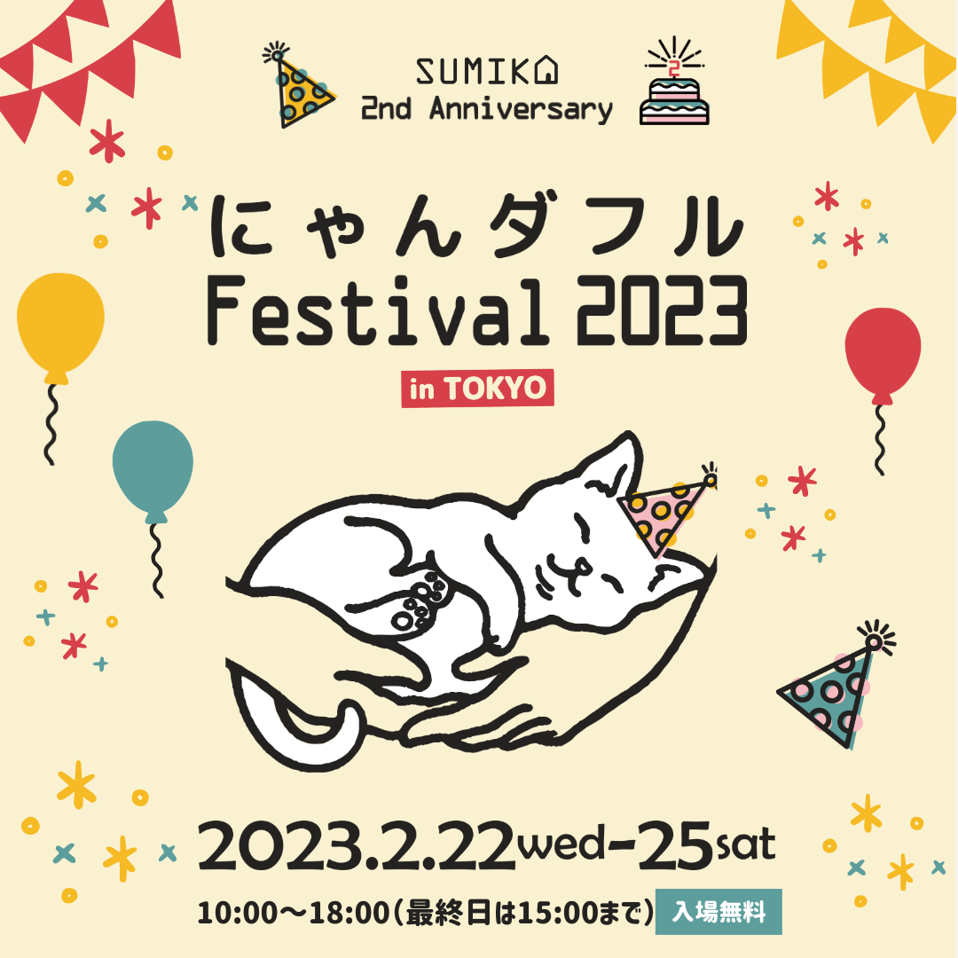 株式会社TIRAMISU(本社:東京都世田谷区 代表取締役:高澤 匡 以下「当社」)が運営する 猫ぐらしブランド「キミとワタシのSUMIKA」は2023年2月22日から2月25日の4日間に渡り「ii-Crossing」(東京都千代田区飯田橋)にて、SUMIKA設立2周年記念イベント、SUMIKA 2nd Anniversary『にゃんダフルFestival 2023』 in TOKYOを開催いたします。ブランド商品だけでなく、多くの猫クリエイター様をお迎えし、猫愛溢れる時間をお届けいたします。