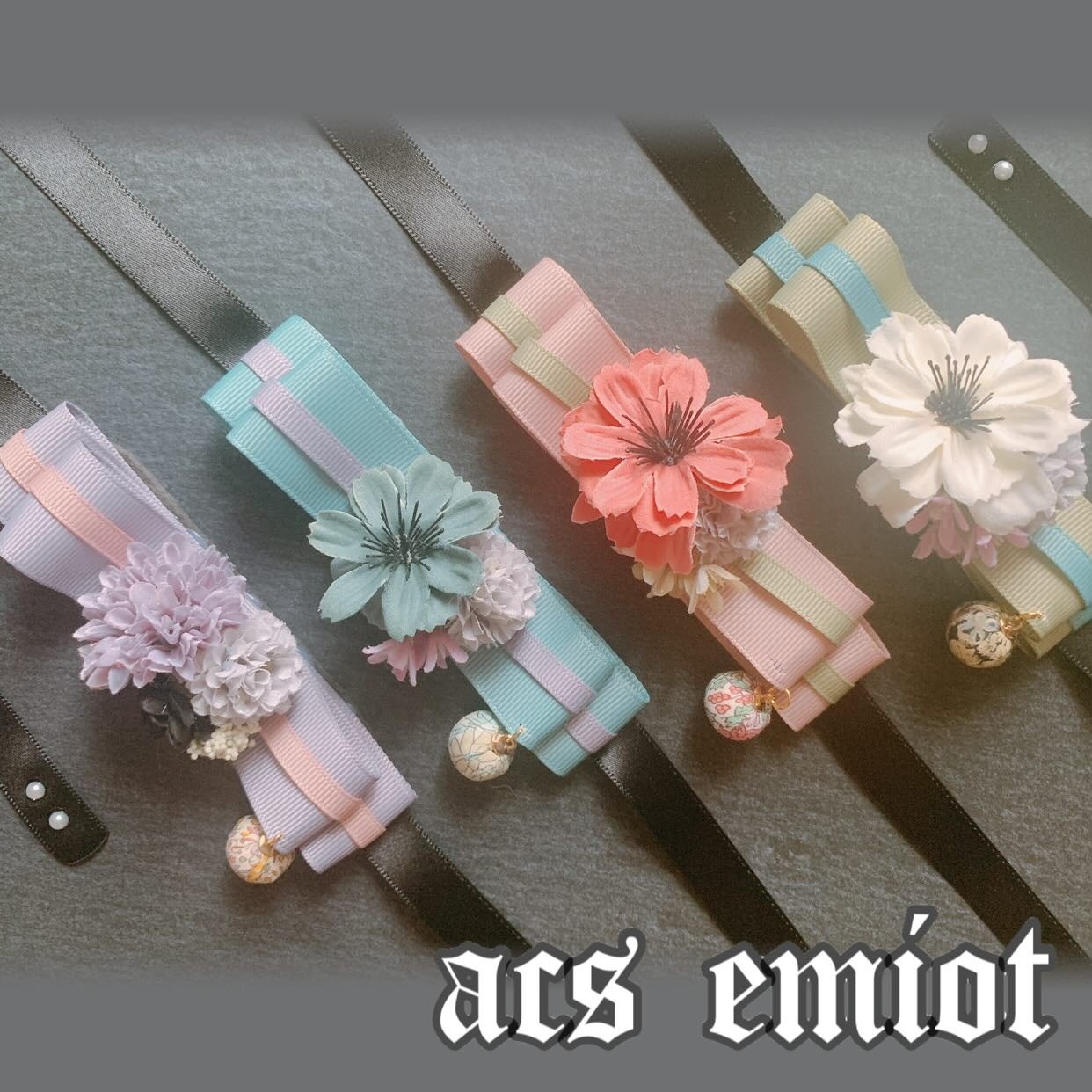 リボンやアーティシャルフラワー、ジュエリーカボションなどを使用した、猫ちゃんのファッションアイテム。