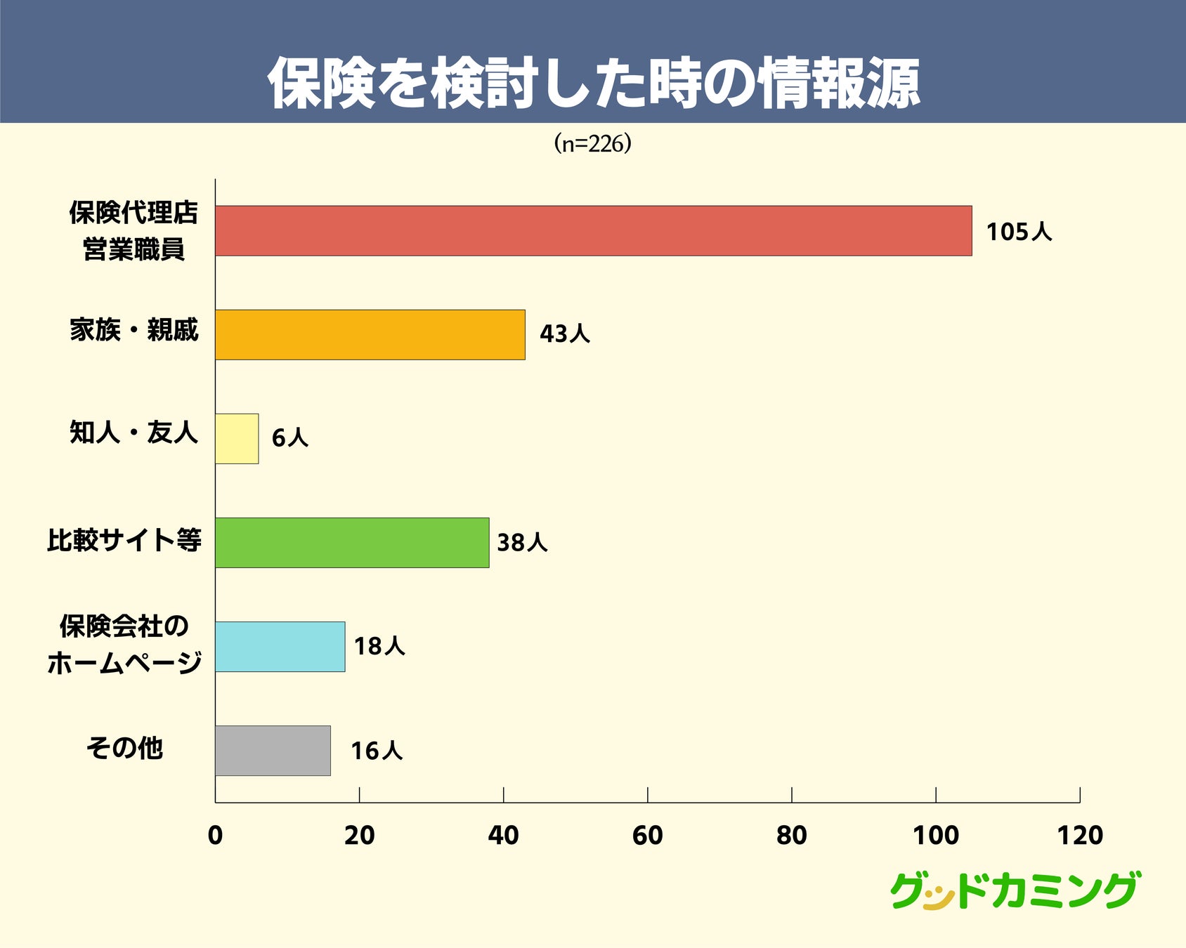 生命保険への加入を検討した経験がある回答者に対して、主な情報源を質問したところ、最も多かったのはやはり「保険代理店(営業職員)」約46.5%(105人)でした。