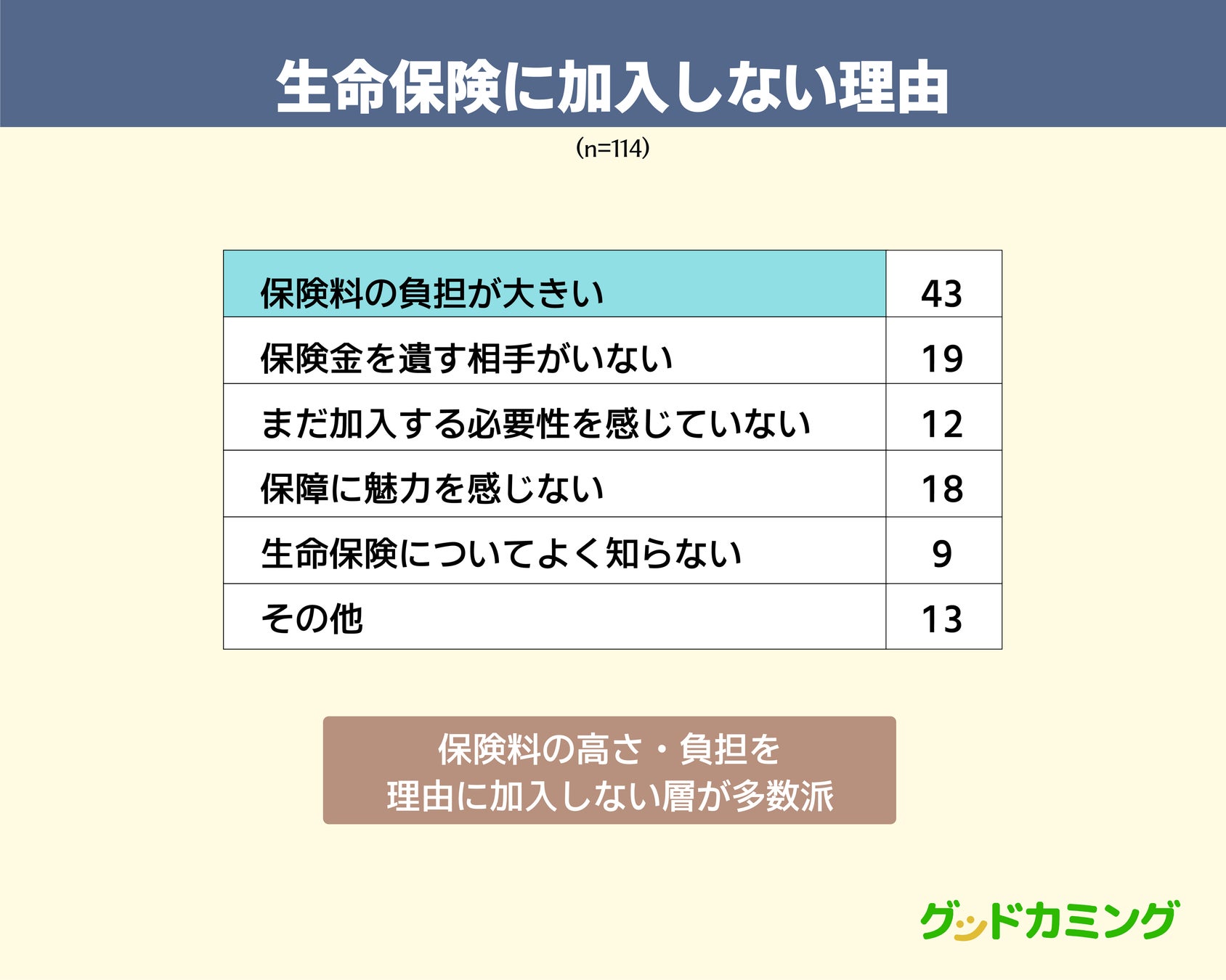 最初の設問で「現在生命保険に加入していない」と回答した114名に対して、生命保険に加入しない理由を聞いたところ、最も多い理由は「保険料の負担が大きい」約37.7%(43人)でした。