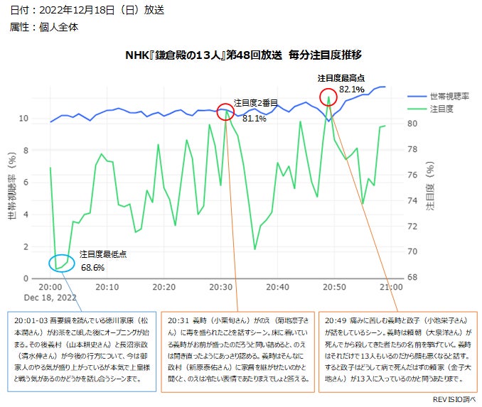 ご家庭に人体認識技術を搭載した機器を設置し、テレビスクリーンの「視られている量」を測るREVISIO株式会社(2022/10/1にTVISION INSIGHTSから社名を変更、所在地 :東京都千代田区、代表取締役社長 郡谷 康士、以下REVISIO)は、2022年1月にスタートした、三谷幸喜さん脚本・小栗旬さん主演の『鎌倉殿の13人』を、毎放送回、視聴者がどのシーンに注目したのかを分析しています。