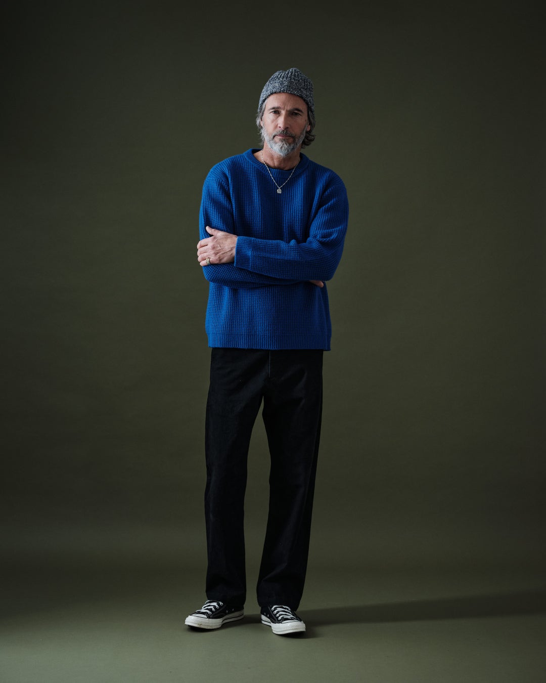 ベーシックなワッフル編みのニットは幅広いコーディネートに合わせられます。