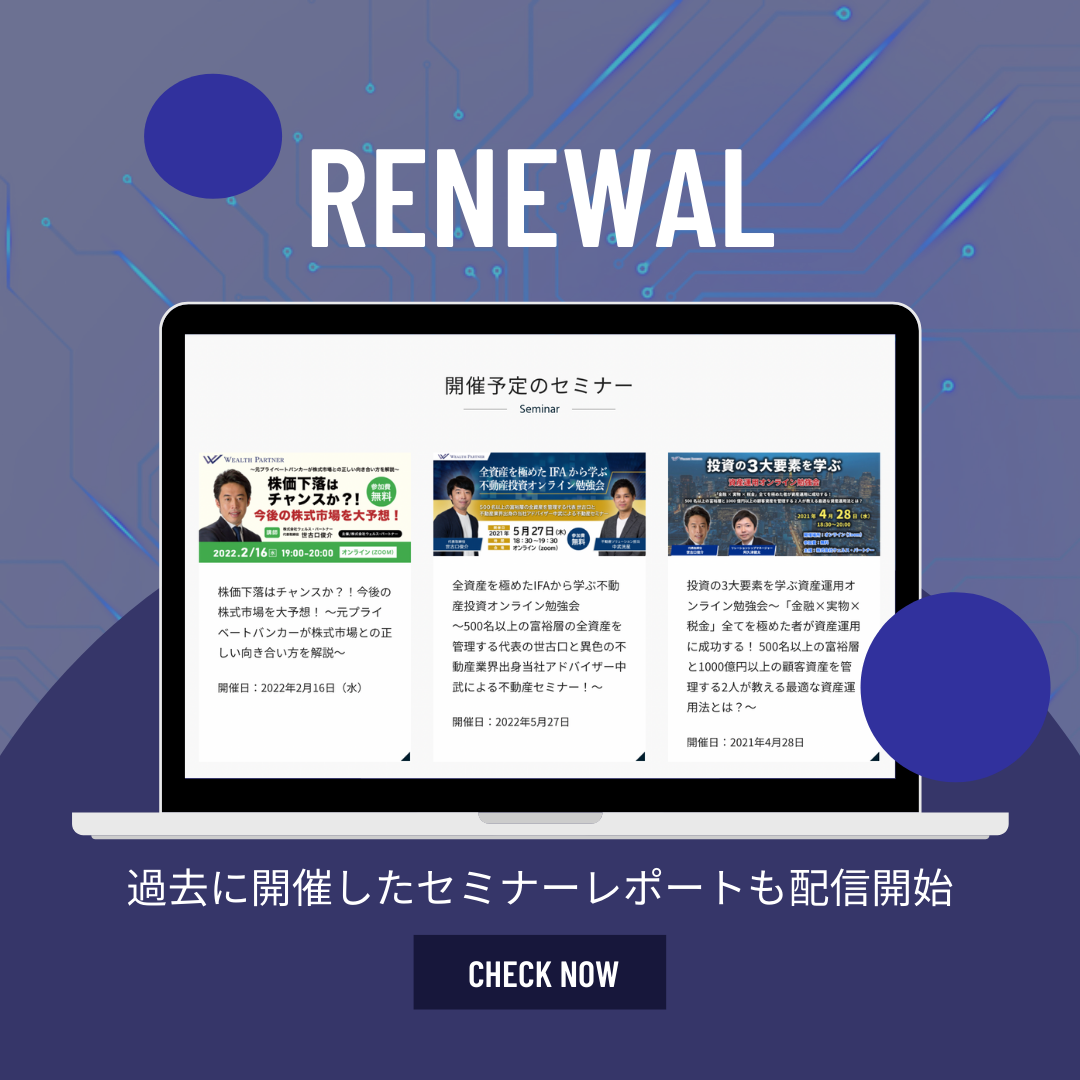 富裕層向けにIFA事業や不動産仲介業を行う株式会社ウェルス・パートナー(代表取締役:世古口俊介、本社:東京都港区、以下「当社」)は、2022年4月21日(木)より弊社コーポレートサイトの「セミナー情報」がリニューアルオープンいたしました。