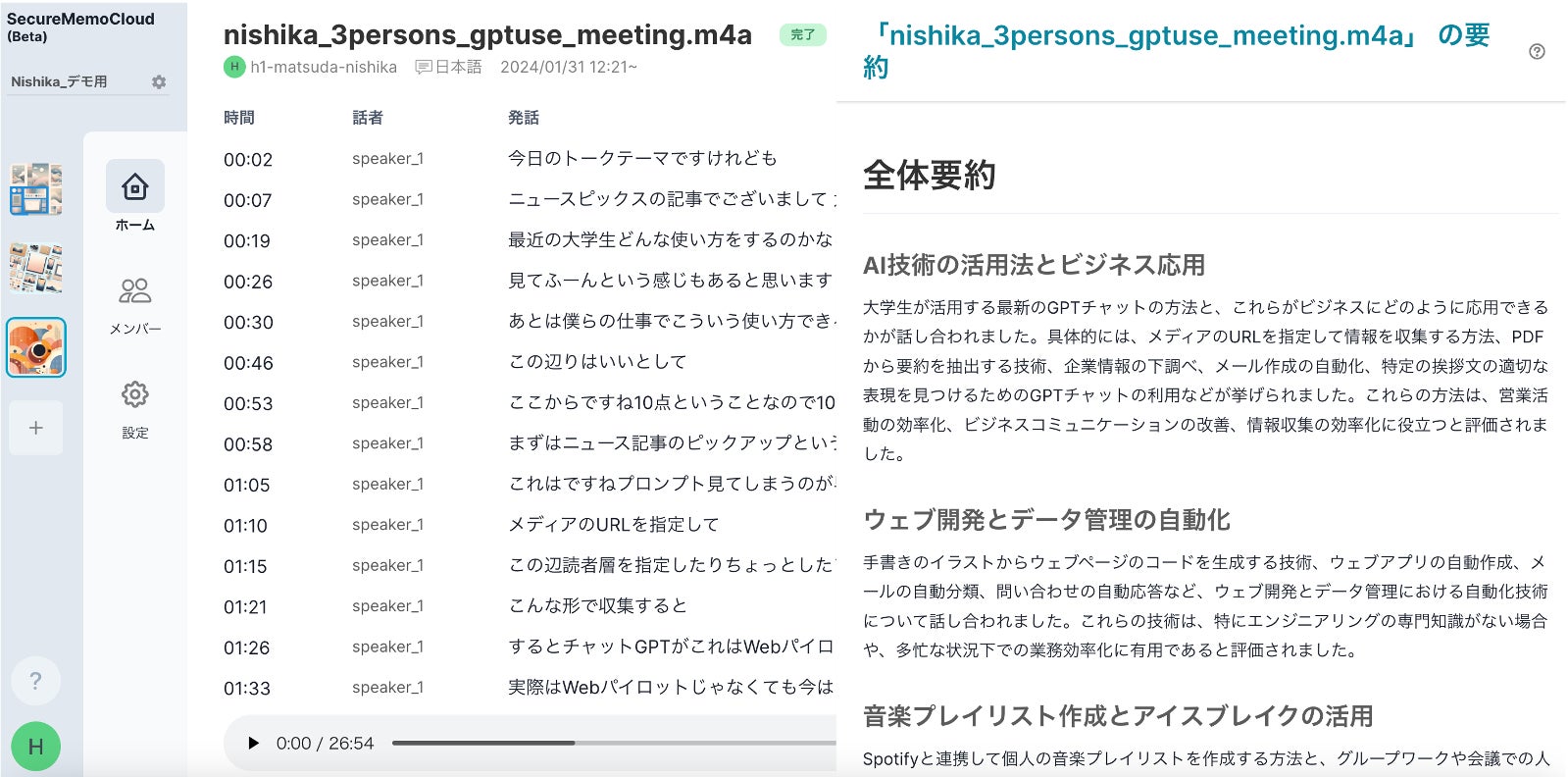 法人利用を想定し、世界最高水準の高精度AI文字起こし・生成AIによる会議録特化型要約を行うサービス「SecureMemoCloud」をNishikaが開発。正式版をリリース。