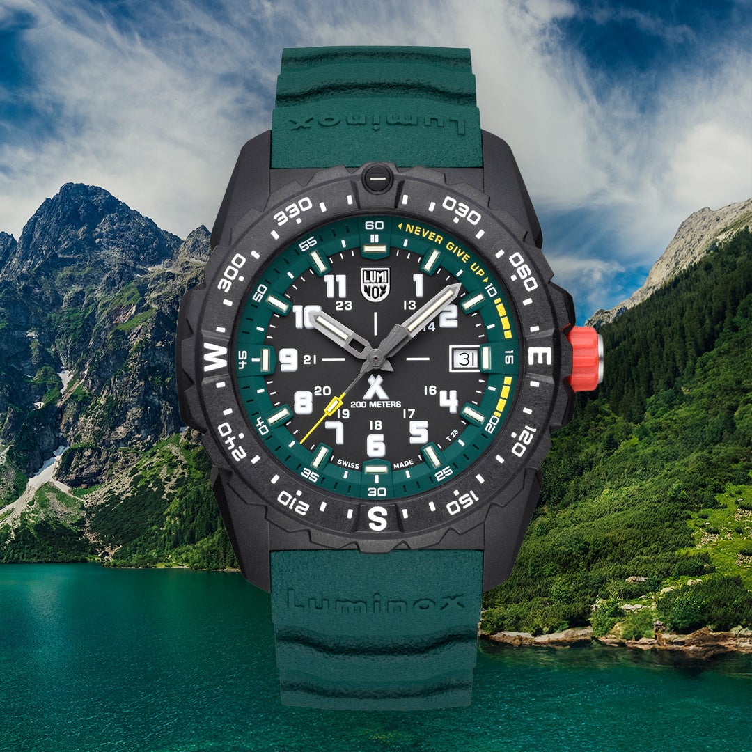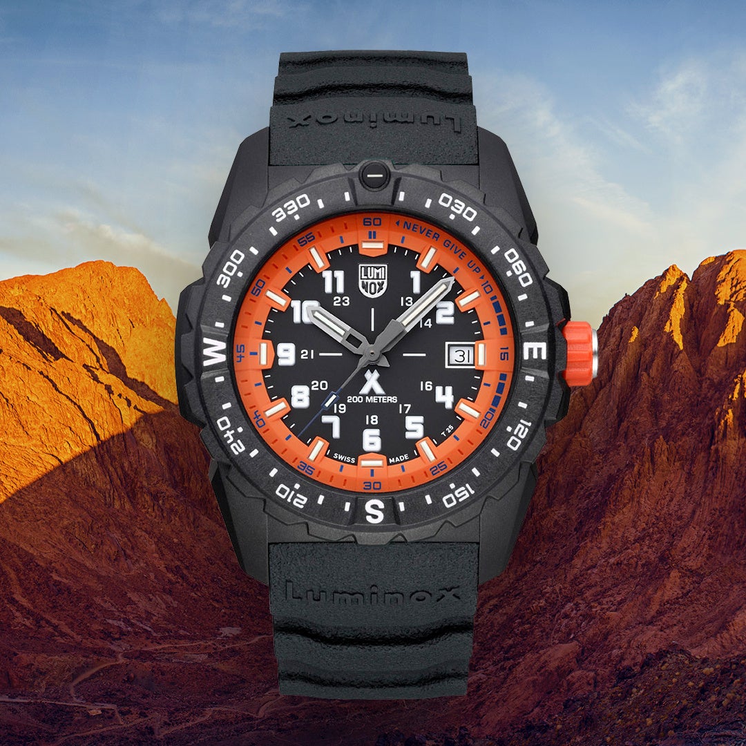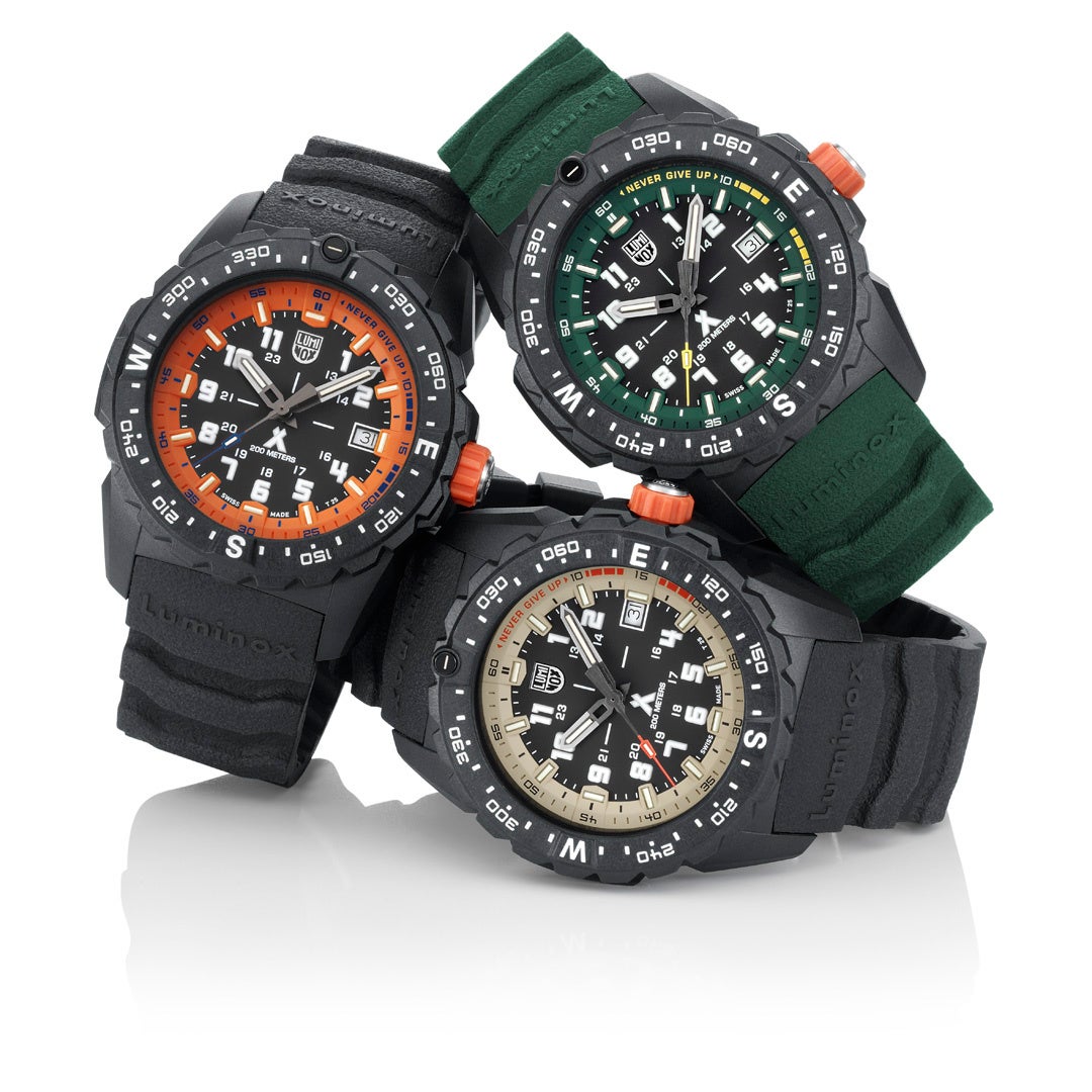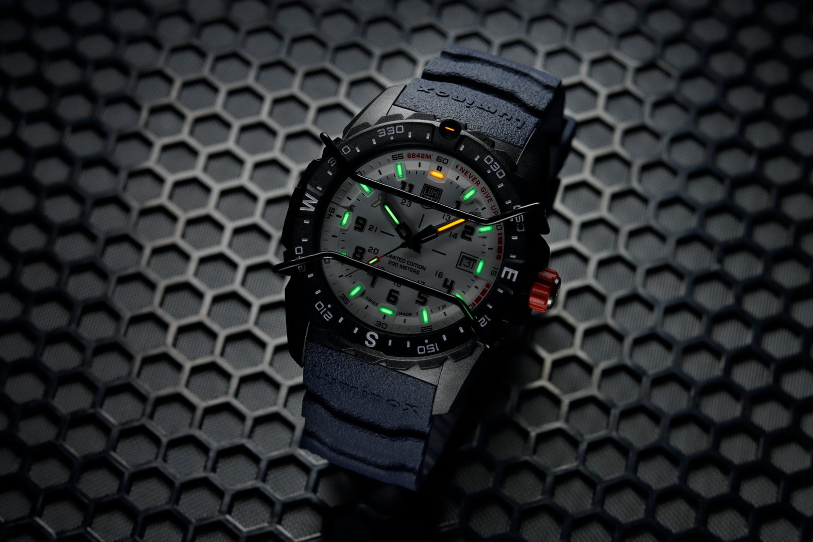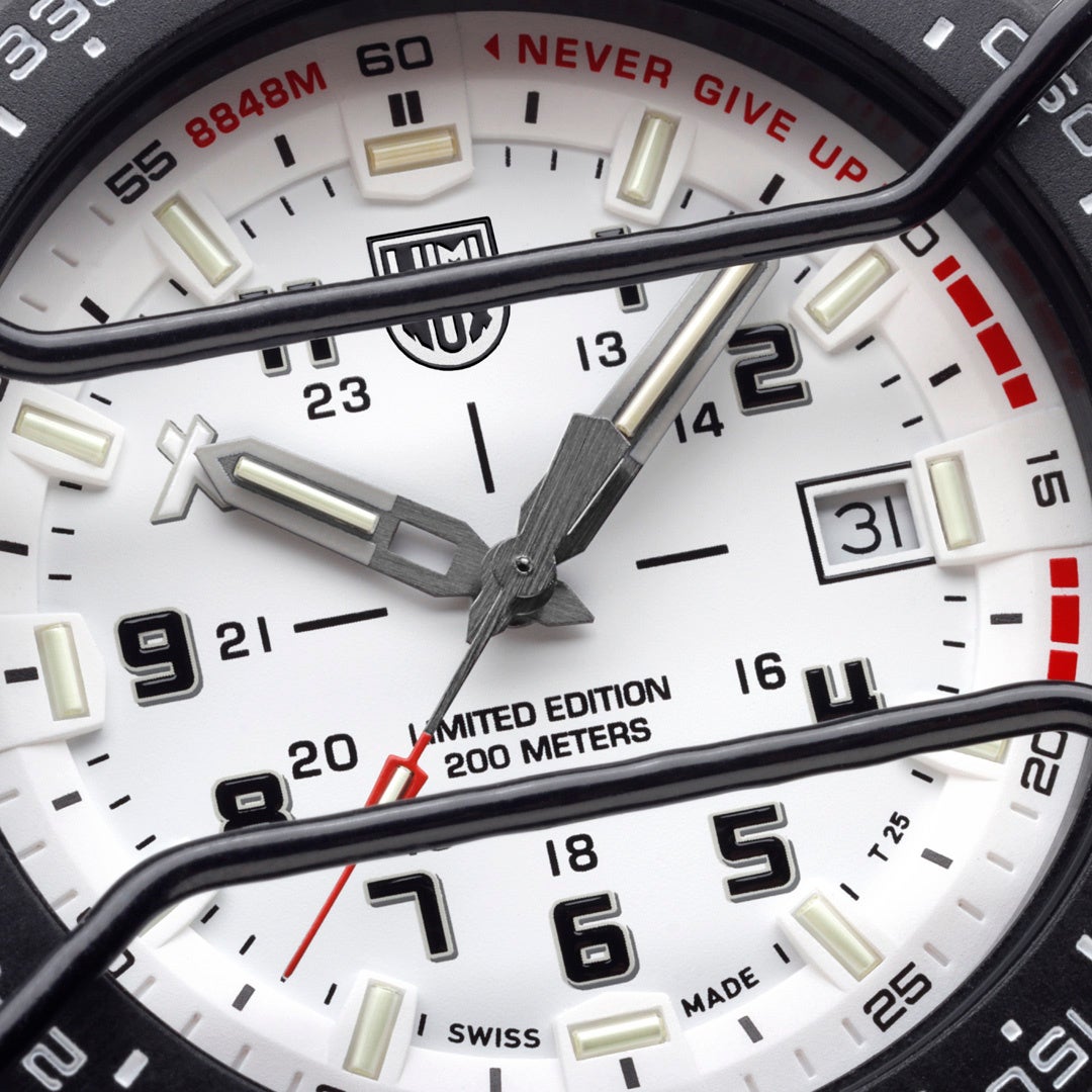 世界限定モデルのケースにはシームレスに接続された一体型ブレスレットも初搭載。ネパールの国旗カラーに合わせた、印象的なホワイト文字盤、深いブルーストラップ、レッドリューズが特徴。 裏蓋にはエベレストのレリーフが施され、外輪にはエベレストの高さを表す「8848M」の文字が刻まれています。更に、ガラスを保護する取り外し可能な保護バーを備えており、荒れた地形に挑戦するアウトドア冒険家に最適。保護バーはすでに取り付けられていますが、いつでも簡単に取り外したり交換でき、コレクションの他のモデルのアクセサリーとして個別に購入することもできます。地球最高峰への登山と深さ200メートルのダイビングの両方に最適な時計となるようにルミノックスによって開発されました。