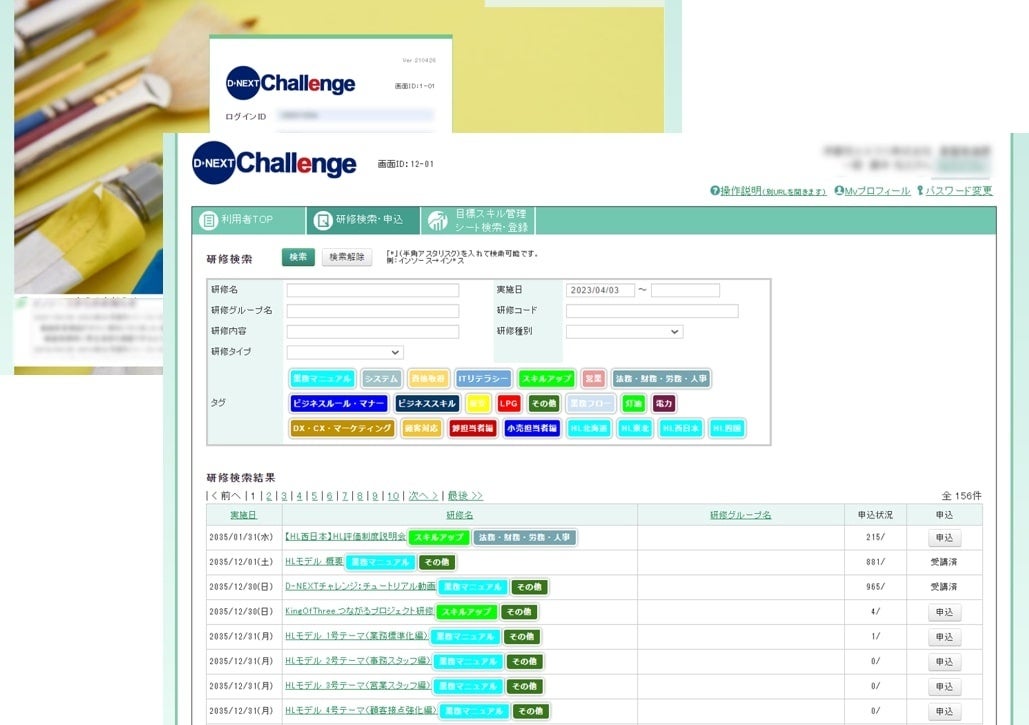 『D-Next-Challenge』とは、社員一人一人が自分の目標を定めスキルアップを図る事が出来る人材育成プラットフォームです。従来はOJTによる技術の伝承を主体として社員育成を行ってきましたが、同プラットフォームにより、HLグループ会社全体のノウハウを可視化し、共有することで、いつでもどこでも学べる環境をデジタルで実現いたしました。