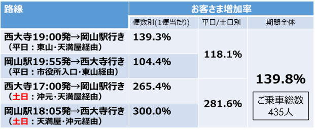 ・土日はお客様のご利用が少ない路線の運行に当てたため、通常時に比べた増加率は大きな効果が得られました。