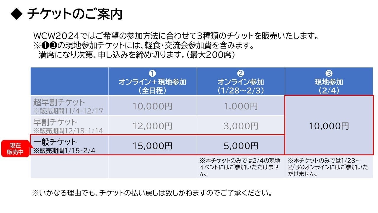 WCW2024ではご希望の参加方法に合わせて3種類のチケットを販売いたします。