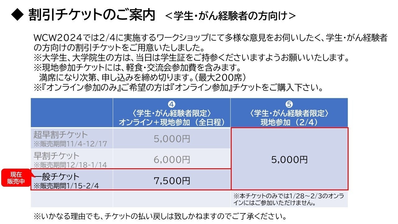 また2月4日(日)に実施するワークショップにて、多様なご意見を伺いたく、学生・がん経験者の方向けの割引チケットをご用意しました。
