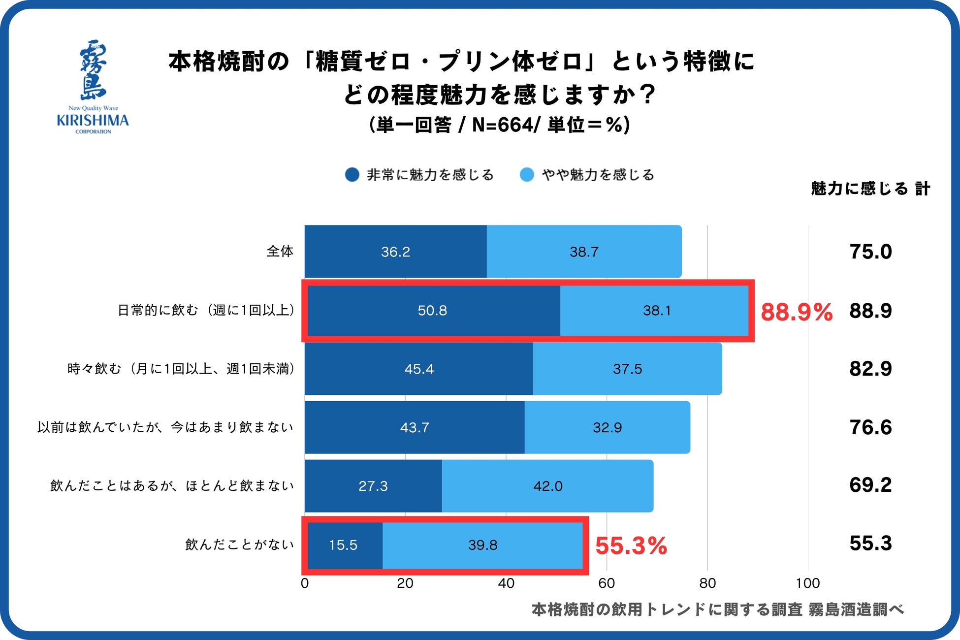 また、その特徴にどの程度魅力を感じるかを聞いたところ、「日常的に飲む(週に1回以上)」層では88.9%が魅力を感じると回答。一方、「飲んだことがない」層においても半数以上の55.3%が魅力を感じると回答し、認知度を大きく上回る結果となりました。本格焼酎の「糖質ゼロ・プリン体ゼロ」という特徴は、既存の飲用層にとどまらず、未経験層にとっても新たな興味喚起のきっかけとなる可能性があると言えます。