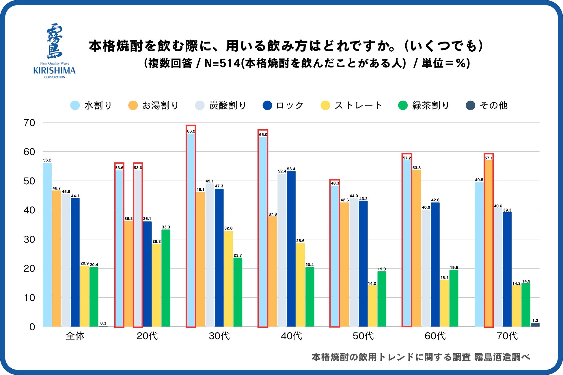 世代別に見てみると、20代で最も用いられる飲み方は「炭酸割り」と「水割り」(53.6%)、30~60代では「水割り」が1位、70代では「お湯割り」(57.1%)が1位となり、世代によって好まれる飲み方が分かれる結果となりました。