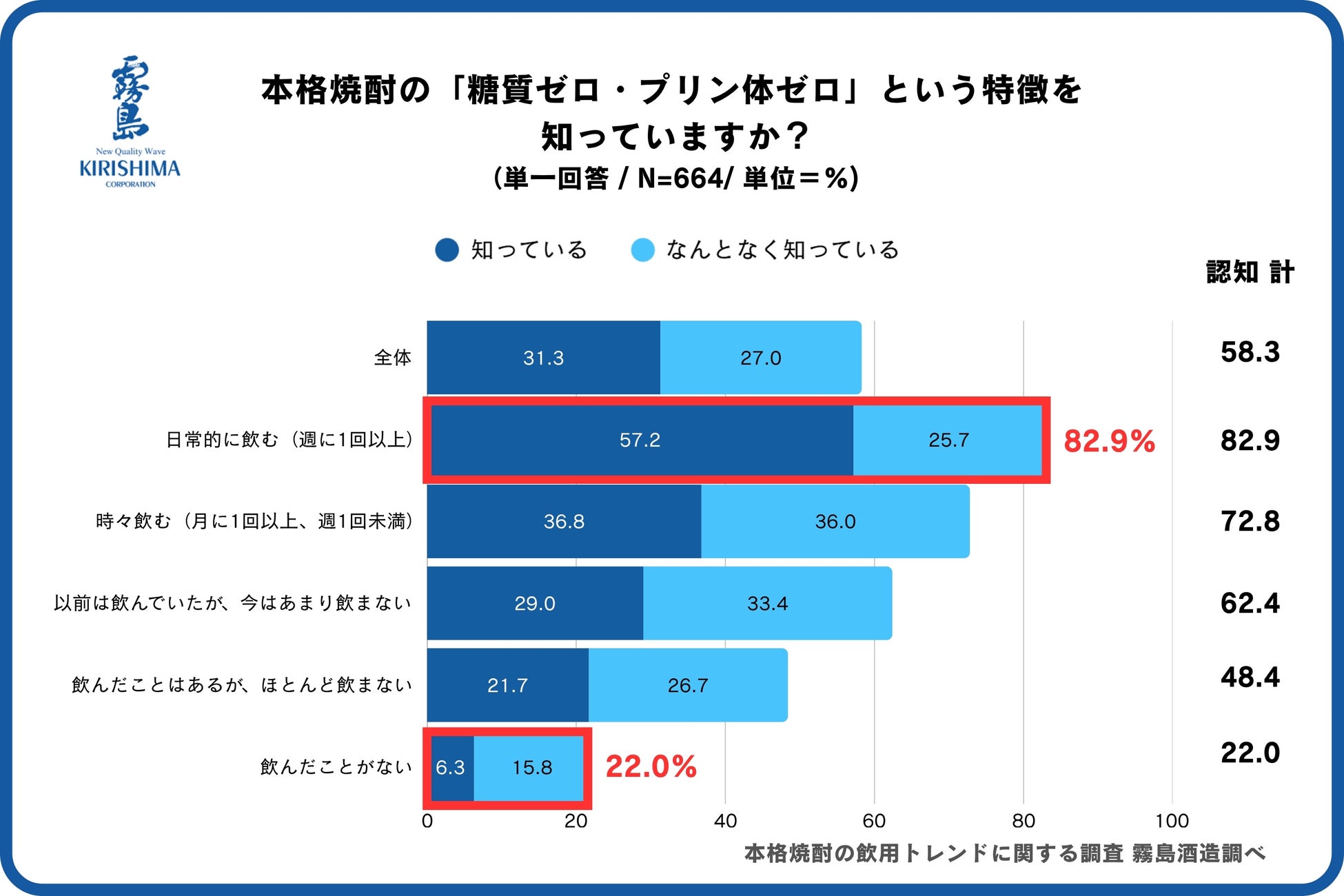 本格焼酎の「糖質ゼロ※1・プリン体ゼロ※1※2」という特徴を知っているかを聞いたところ、「日常的に飲む(週に1回以上)」層では82.9%と高い認知を得ているのに対し、「飲んだことがない」層では22.0%と認知度が低いことが明らかになりました。