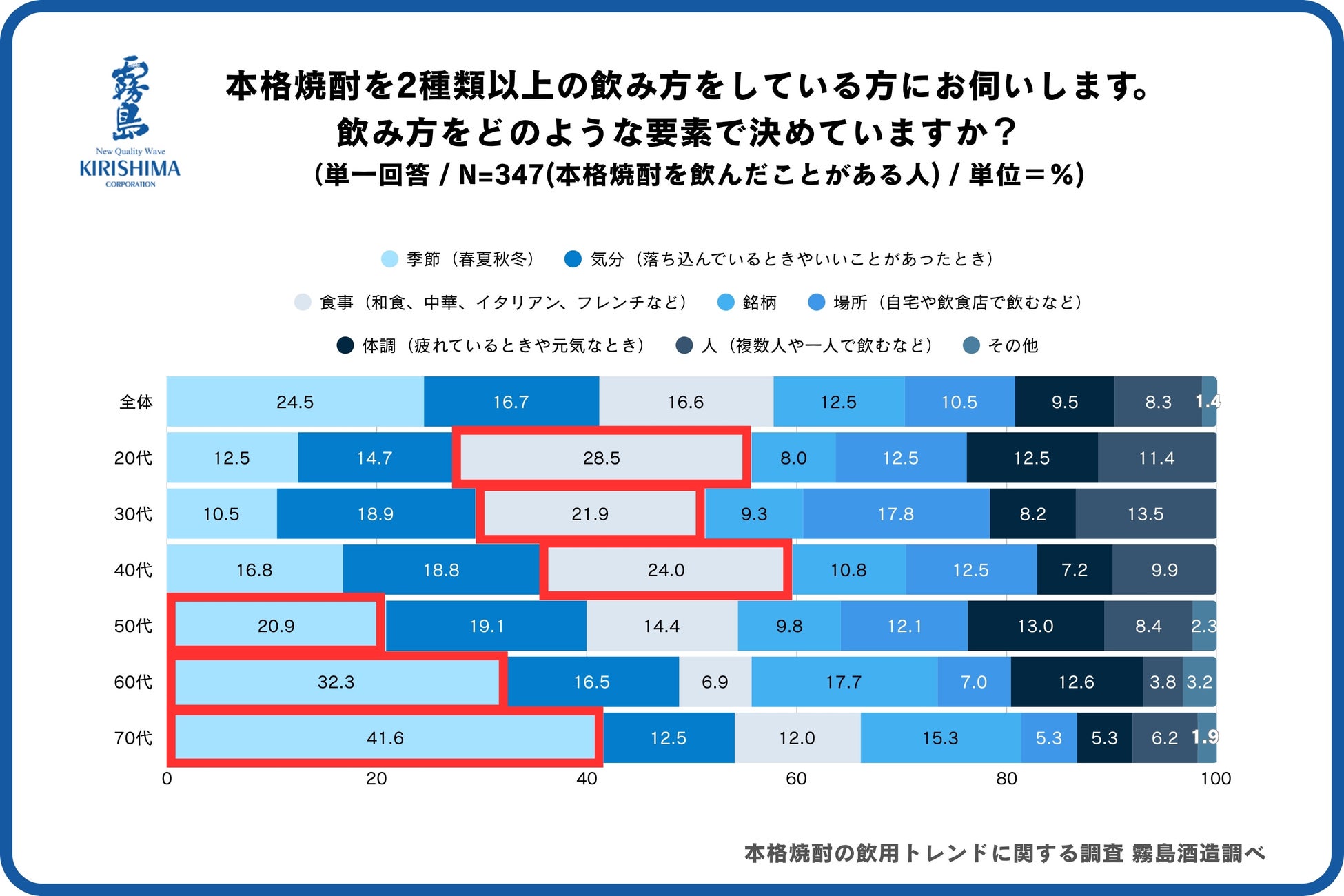 霧島酒造、本格焼酎の飲用トレンド調査を実施。全世代が「すっきりと飲みやすい」味わいを最も重視、20代は「フルーティーな香り」への期待、40代以下では食事に合わせて飲み方を変えるペアリング志向が判明