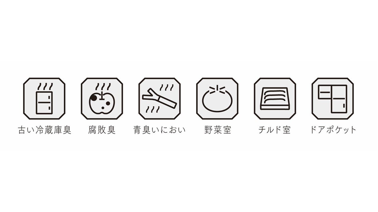 古い冷蔵庫臭、腐敗臭、青臭いにおいなど消臭効果を発揮する臭いがアイコンで一目でわかります。
