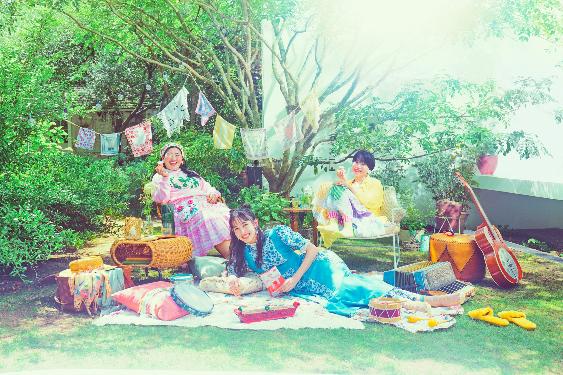 木漏れ日が降り注ぐお庭でくつろぎながら、「蒟蒻畑 For Gourmet」贅沢いちごミルクを楽しむ3人。