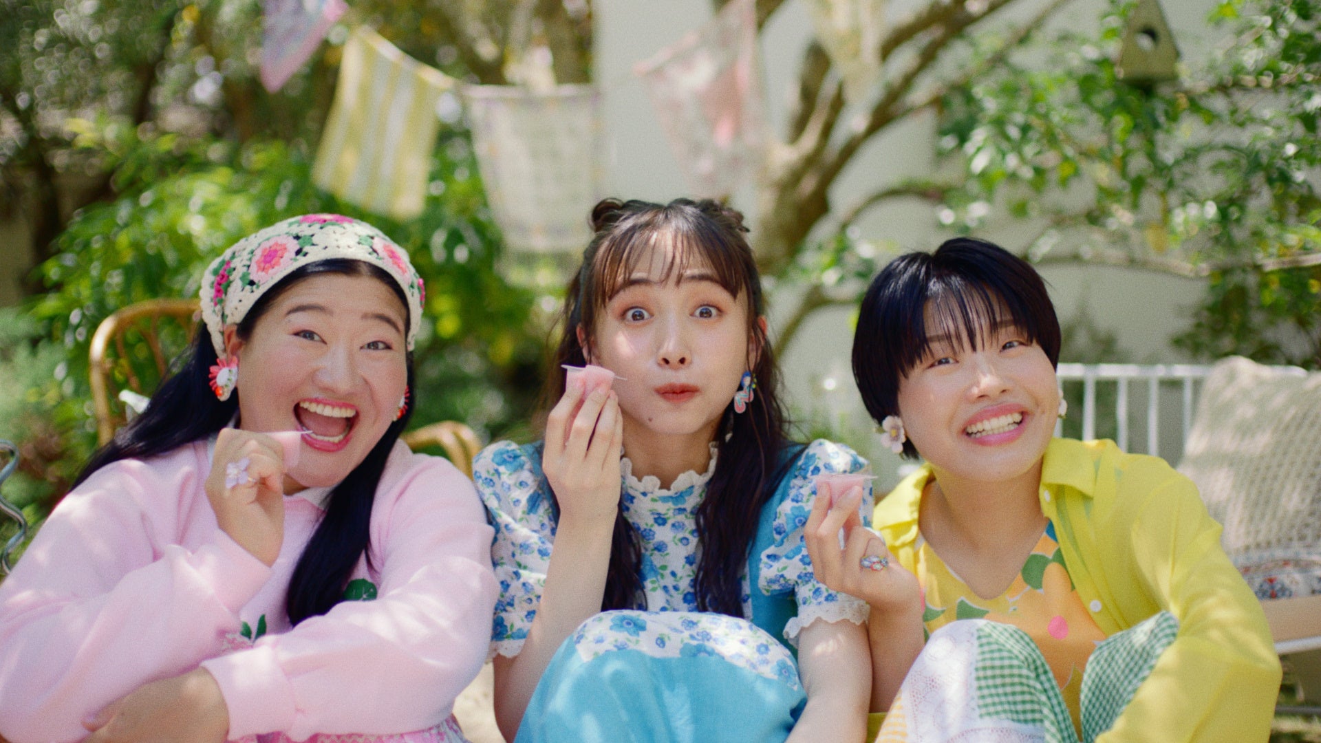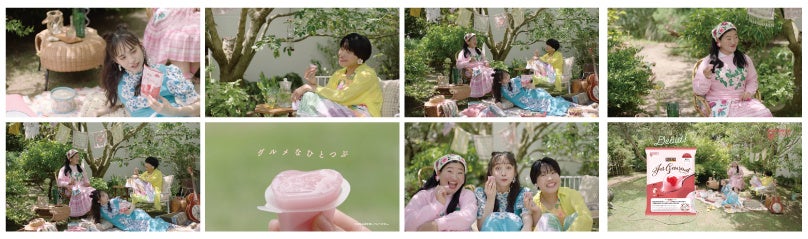 リビングやお庭で、お友だち同士でくつろぐリラックスした雰囲気の中で、楽しくおしゃべりしながら「蒟蒻畑 For Gourmet(フォーグルメ)」を味わう3人。何度でも観たくなるようなオシャレでハッピーな世界観のCMで、グルメなひとつぶがお届けする、おいしい幸せを描きます。