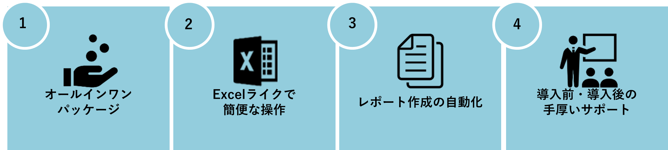 企業の保有する様々なデータ分析のご要望に対応する機能を標準装備。オールインワンパッケージ提供のため、機能追加は定額保守料の範囲内で行い、追加コストがかかりません。お客様の実業務に基づいた豊富なテンプレートと充実したサポートメニューで、データ分析業務の効率化、経営の見える化に貢献します。