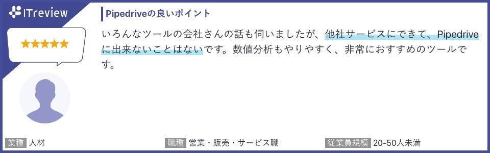 「Pipedrive」は、ITreviewで平均★4.5(2024年10月18日時点)という高評価を獲得し、実際のユーザーからも「営業プロセスの効率化が劇的に進んだ」「使いやすいUIで、誰でも簡単に操作できる」などの声をいただいています。当製品のご利用者様から実際に寄せられたレビューを一部ご紹介します。