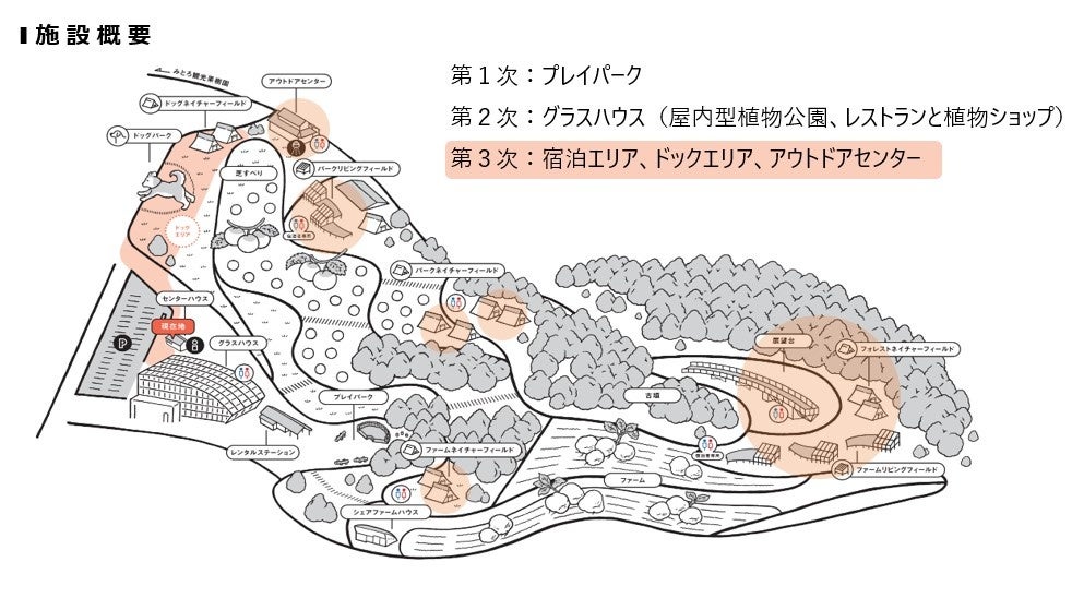 植物店舗(FURERU)、宿泊施設(みとろ版グランピング、キャンプ、BBQ)、アウトドアセンター、ドッグエリア