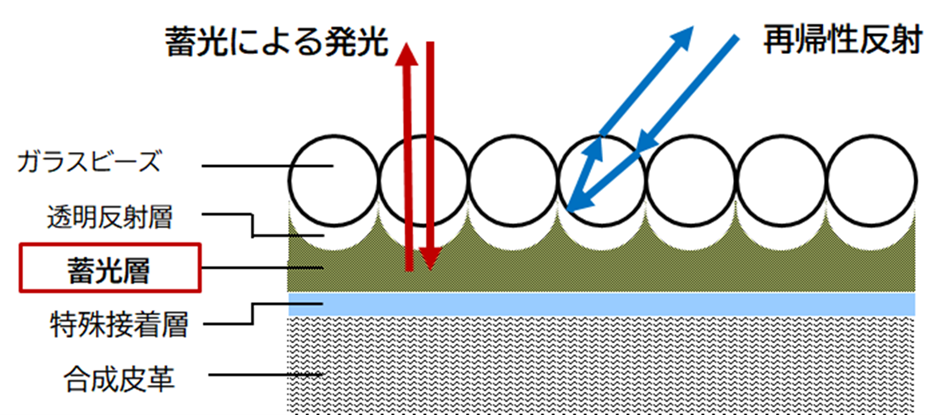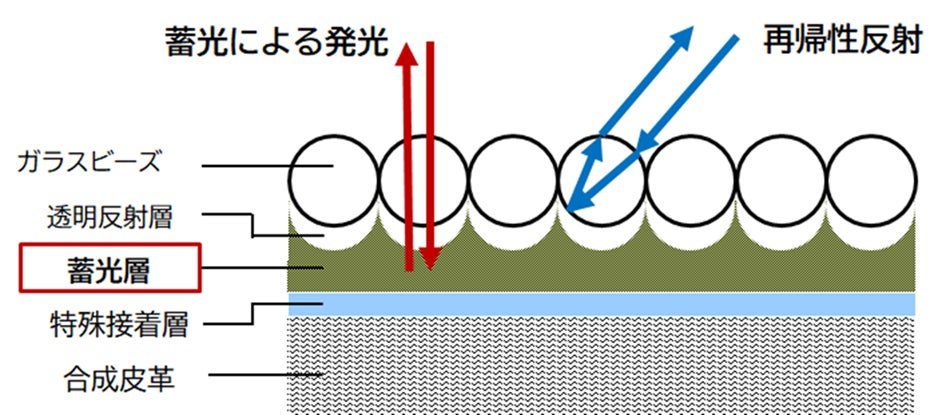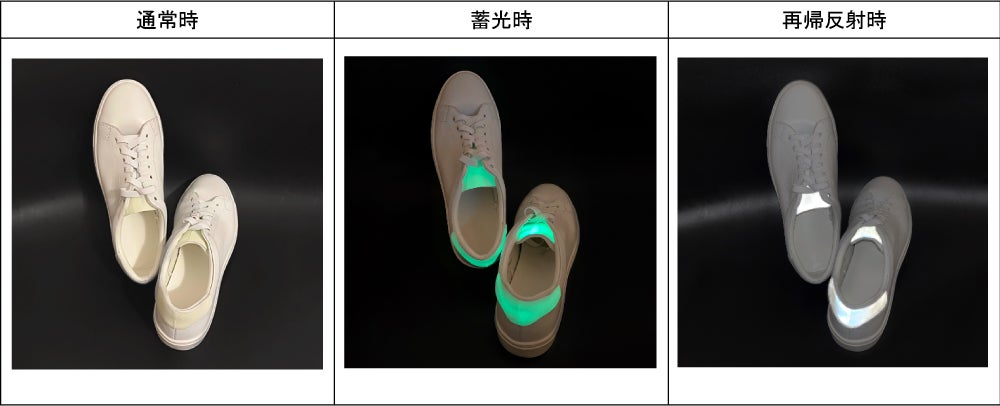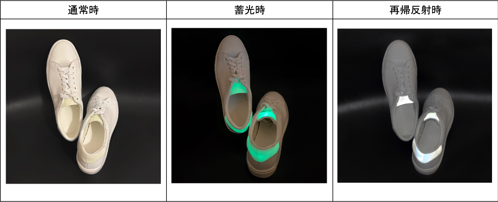※蓄光反射とは:明るい時に光を蓄え、暗い時にはその蓄えた光を放出することで、自ら発光する再帰性反射を指します。