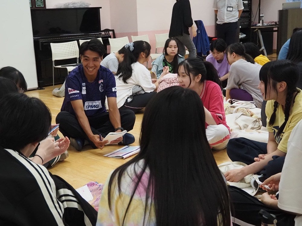 この日、教室で議論が交わされたのは、正解のない問いです。それでも、生徒たちは全員がグループリーダーを中心に熱心に議論。クリアソンの西山大輝、赤井シャロッド裕貴の両選手もグループに加わり、真剣なやりとりが繰り広げられました。