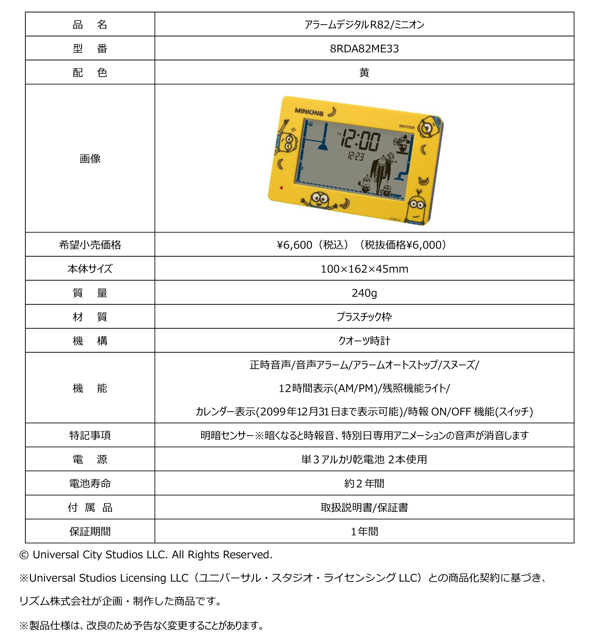 リズム株式会社(取締役社長 平田博美)は、時刻によって背景が変化して、7月15日(金)公開の最新映画『ミニオンズ フィーバー』でも大活躍の人気キャラクター “怪盗グルー” や “ミニオン” たちがおしゃべりしながらさまざまなアクションをするデジタル時計「アラームデジタルR82/ミニオン」を7月初旬より発売いたします。