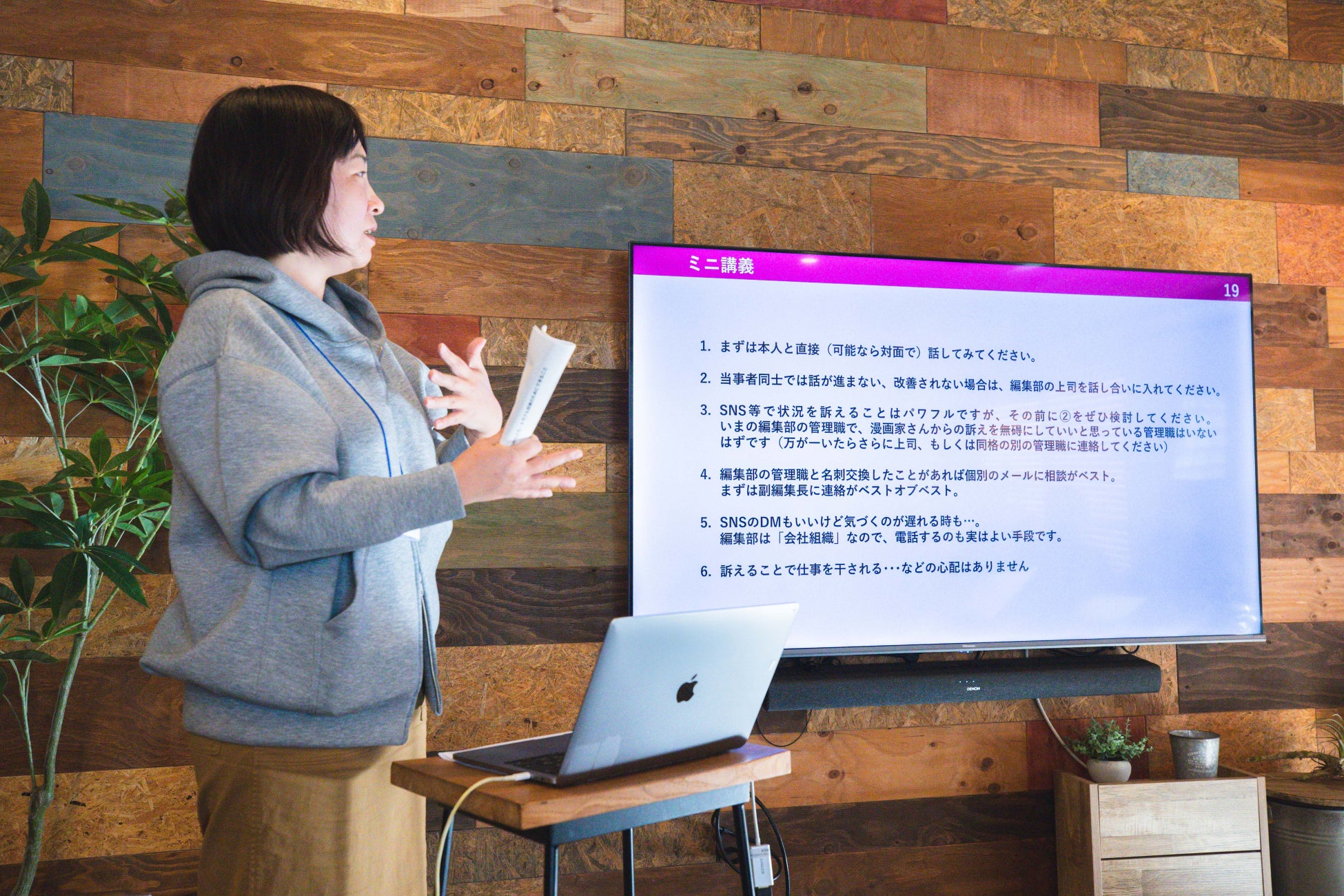同イベントでは、小学館マンガワン編集部の協力により、編集者とのトラブル回避対応をテーマにした講義を行うとともに、似たような悩みを持つ若手作家同士での交流による相互連携強化を図っています。