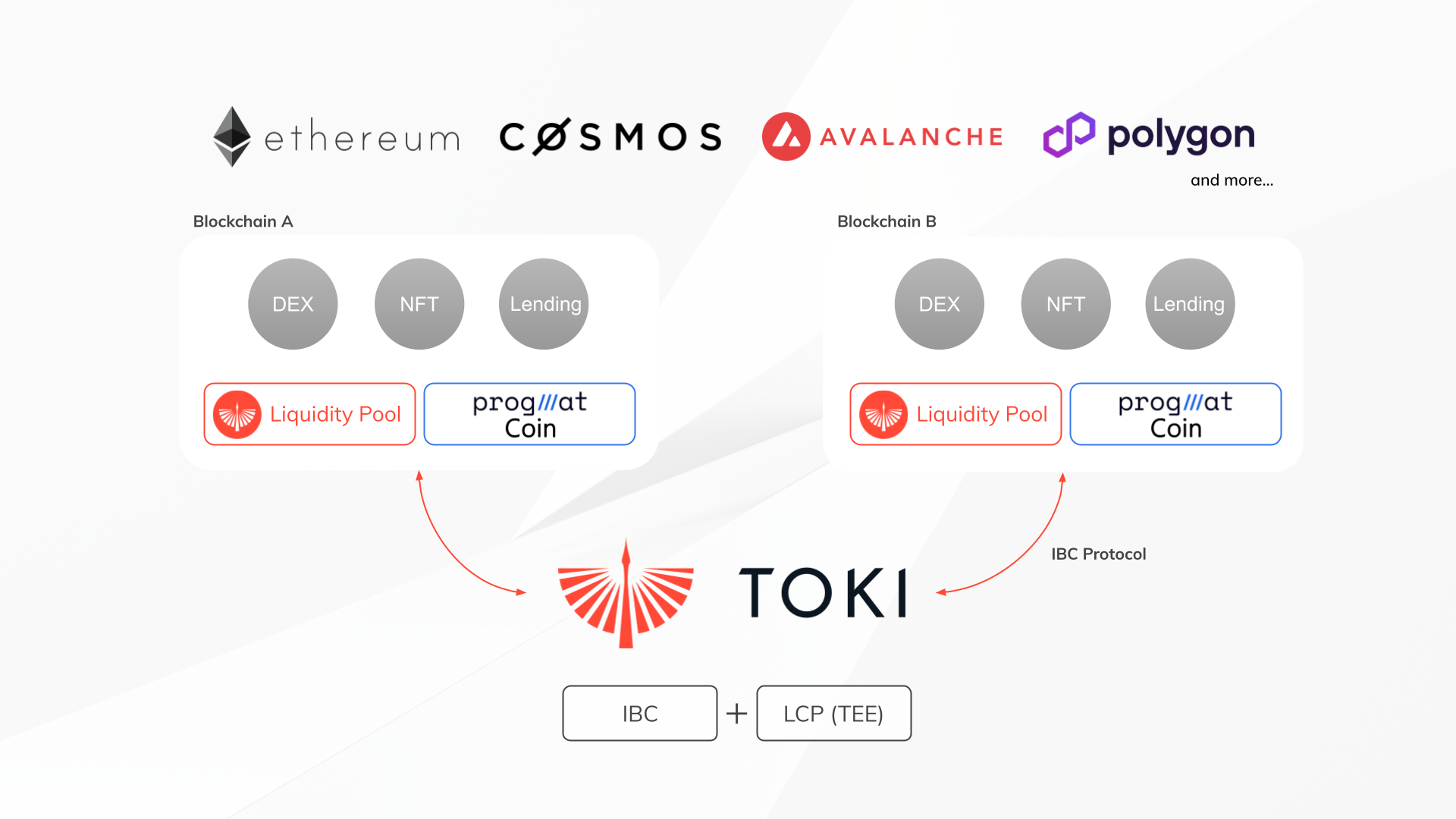 TOKIは、パブリックブロックチェーン間でクロスチェーン取引を可能にする「クロスチェーンブリッジ」の開発を行っており、2023年内のローンチを予定しています。IBC(*1)やDatachainが開発するLCP(*2)を用いた安全性と拡張性に優れたブロックチェーン間通信の技術に加え、高効率な流動性の仕組みに強みを持っています。