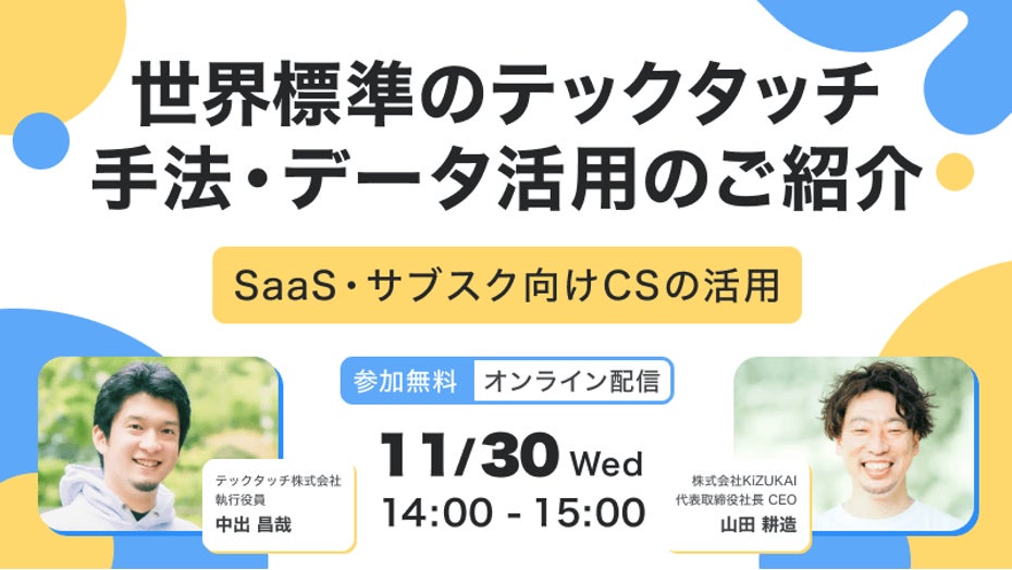 顧客体験管理を収益につなげる次世代型CXMツールを提供する株式会社KiZUKAI(本社:東京都新宿区 代表取締役CEO:山田 耕造)は、2022年11月30日(水)にテックタッチ株式会社(本社:東京都港区 代表取締役CEO:井無田 仲)と共に「“世界標準テックタッチ手法・データ活用のご紹介”」をテーマにSaaS・サブスク向けCSの活用のWebセミナーを開催いたします。