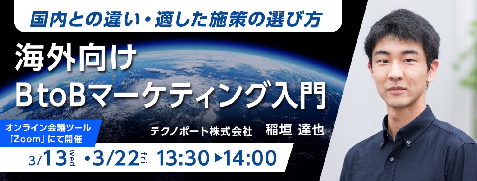 製造業向けのWebマーケティングサービスを提供する、テクノポート株式会社(本社:東京都港区、代表取締役:徳山 正康)は、これまでBtoB企業向けに海外マーケティング支援を行ってきた実績をもとに、マーケティング活動における国内と海外の違いや、適した施策の選び方などを解説するオンラインセミナーを開催いたします。