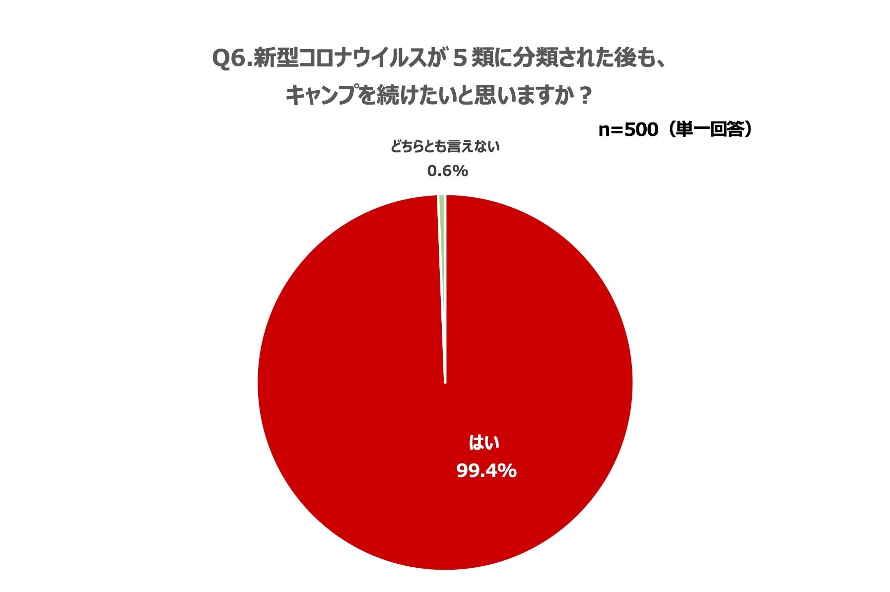 「新型コロナウイルスが5類に分類された後も、キャンプを続けたいと思いますか?」と尋ねたところ「はい」が99.4%、「いいえ」が0.6%という回答になり、キャンプユーザーの熱量の高さが伺えました。