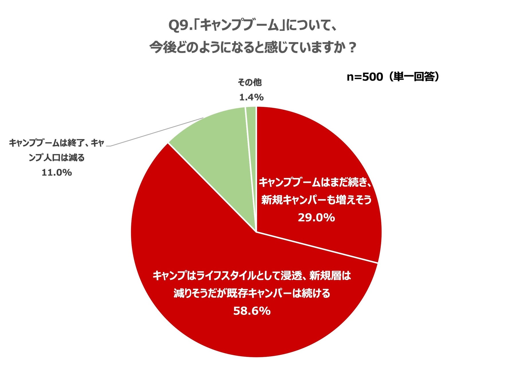 さらに、「キャンプブームについて今後どのようになると感じていますか?」と尋ねたところ、「キャンプはライフスタイルとして浸透、新規層は減りそうだが既存キャンパーは続ける」と回答した人が最も多く58.6%、次に「キャンプブームはまだ続き、新規キャンパーも増えそう」と回答した人が29.0%という結果になり、“キャンプブームが続く”という見解もありながら、“ライフスタイルとして定着する”という声が約6割に及び、キャンプ市場自体は次のステージとして盛り上がりを見せると予想されます。
