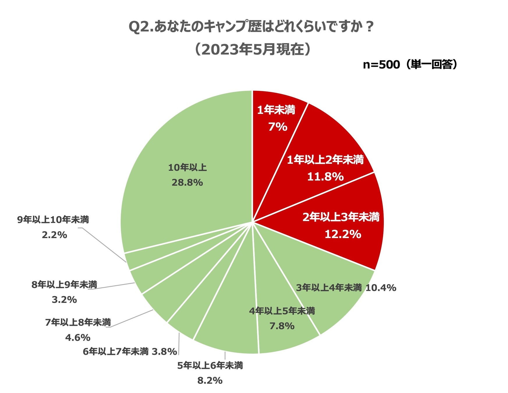 2022年に1回以上キャンプをしたと回答した84.9%の人に、「キャンプ歴」を尋ねたところ、1年未満(2022年にキャンプをスタート)と回答した人が7%、1年以上2年未満(2021年にキャンプをスタート)と回答した人が11.8%となり、2020年、2021年にキャンプをスタートした人の合計は17.8%で、約5人に1人がここ2年間でキャンプを始めていることが分かりました。