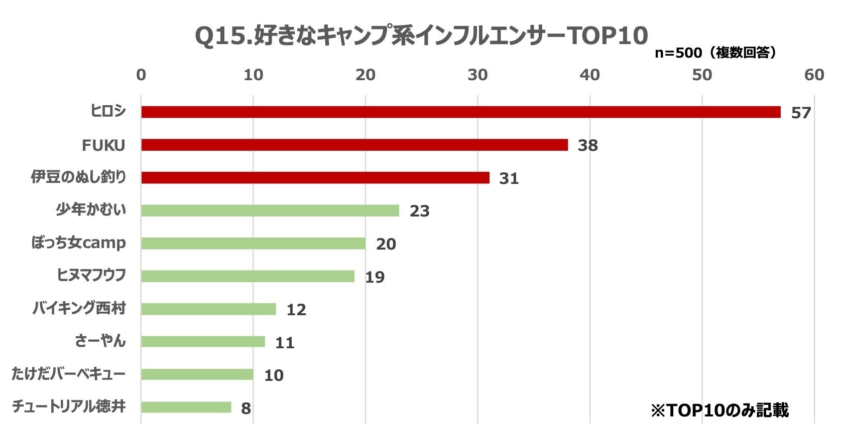 また好きなキャンプ系インフルエンサーを調査したところ、1位はキャンプ芸人としてもお馴染みの「ヒロシさん」、2位はキャンプ系YouTuber「FUKUさん」、3位もキャンプ系YouTuber「伊豆のぬし釣りさん」がランクインしました。YouTubeを情報の収集源にしている方が多いことから、YouTubeのチャンネル登録者数が多い方に票が集まったように見受けられます。