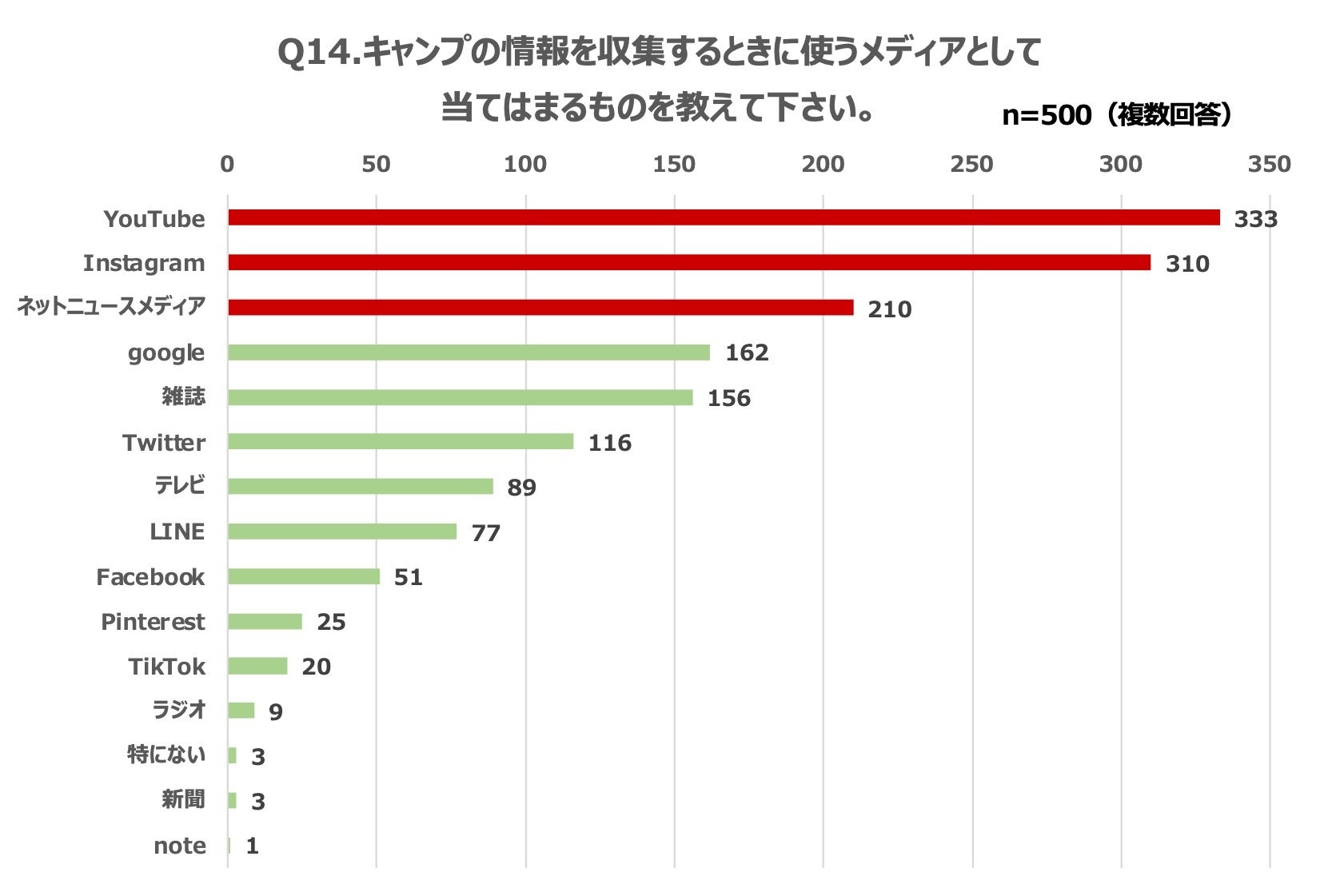 「キャンプの情報を収集する時に使うメディア」を尋ねたところ、1位「YouTube」、2位「Instagram」、3位「ネットニュースメディア」となりました。キャンプ系インフルエンサーが台頭した影響か、SNSをキャンプの情報収集源にしている方が多いことがわかりました。