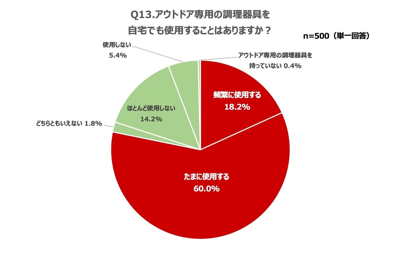 「キャンプで挑戦した料理を、自宅でも再度調理して楽しんだことはありますか?」と尋ねたところ78%の方が「はい」と回答しました。また「アウトドア専用の調理器具を自宅でも使用することはありますか?」と尋ねたところ、「頻繁に使用する」と回答した人が18.2%、「たまに使用する」と回答した人が60%と、合計約8割の方が自宅でも利用していることが明らかになりました。昨年の『ソトレシピ総研「キャンプトレンド調査2022」(https://sotorecipe.com/magazines/souken-4)』でも同等の数値での回答が多かったように、引き続きキャンプ飯を自宅で楽しむ「内食化」が進んでいることがわかりました。