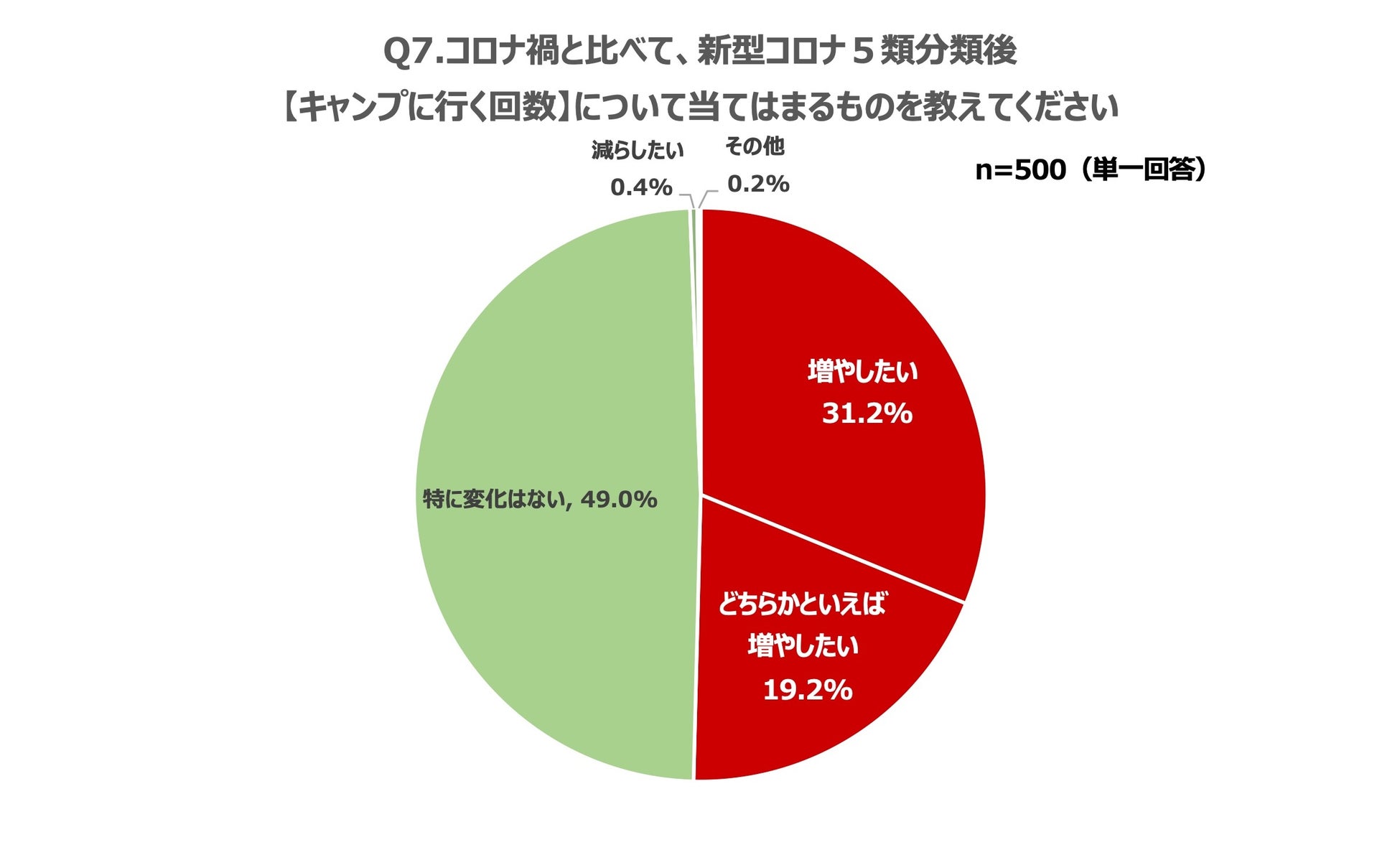 「コロナ禍に比べて、新型コロナ5類分類後キャンプに行く回数」については、「増やしたい」が最も多い31.2%、次に「どちらかと言えば増やした」が19.2%と回答し、またQ1の質問で2022年にキャンプに行っていないと回答した方に、「2023年はキャンプに挑戦してみたいですか?」と尋ねたところ、86.5%もの方が「はい」と答え、2023年はキャンプ市場がより活性化する可能性が見られました。