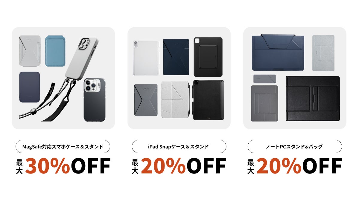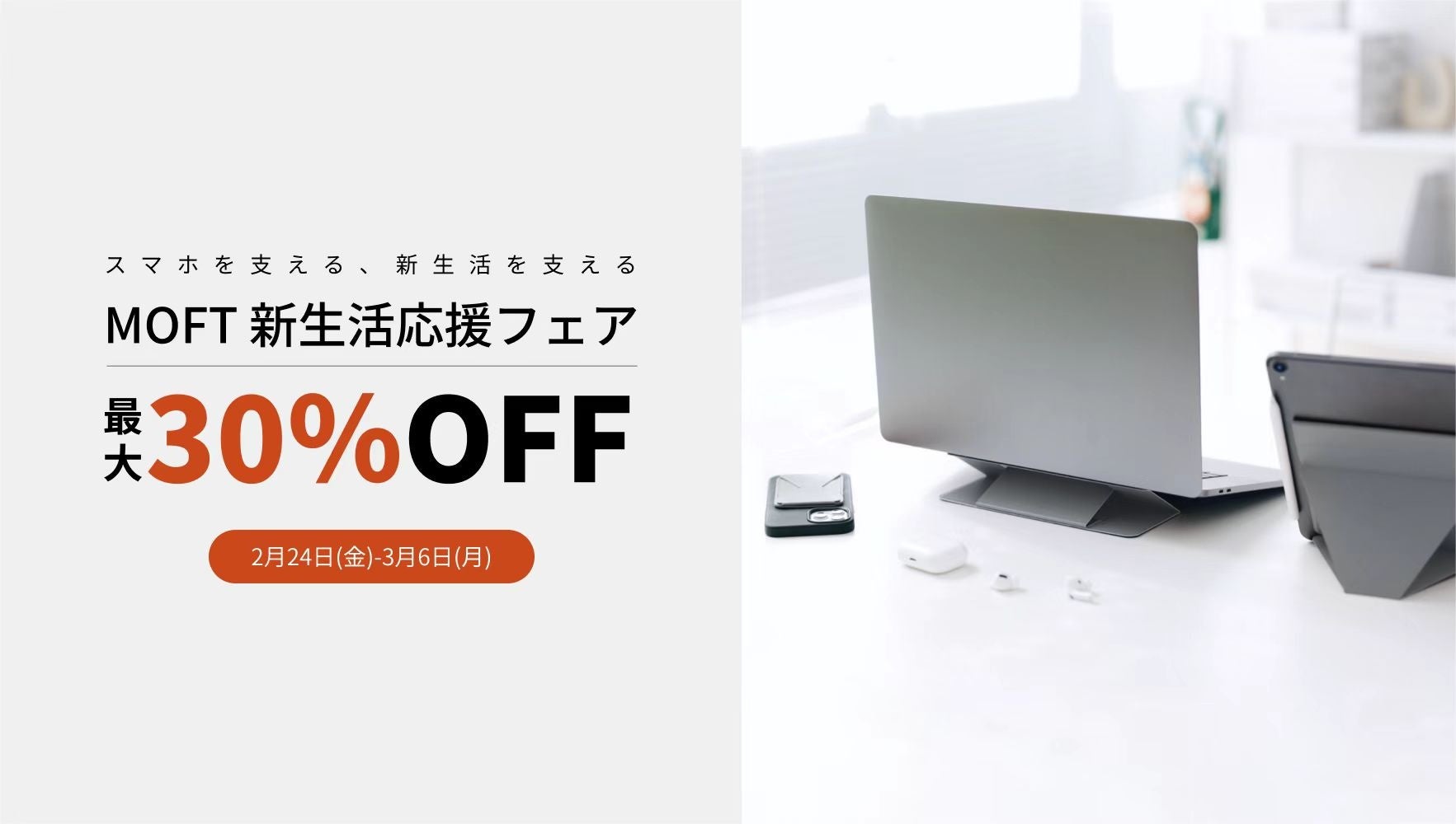 シンプルかつクリエイティブなPC・スマホ・タブレット周辺のアイデア商品を開発し続けるMOFT(モフト)ブランド(LEMORE社、本社:アメリカカリフォルニア、代表取締役:Julianna He)は2023年2月24日(金)より公式ストアにて、期間ごとに変わる対象商品において最大30%OFFのお得な新生活応援フェアを開始しました。